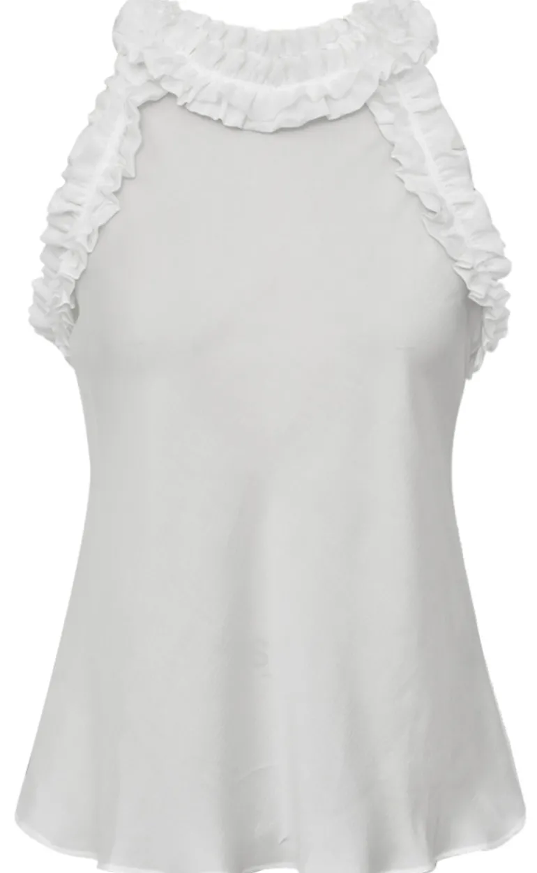 Toppen er enkel og elegant med smukke flæsedetaljer ved hals og ærme.