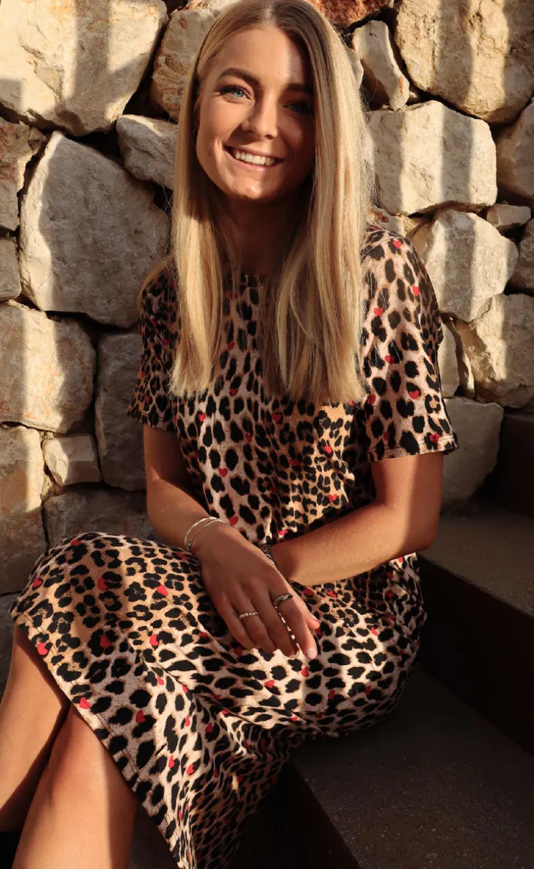 Lang t-shirt kjole fra Liberte i et leoprint med røde hjerter.