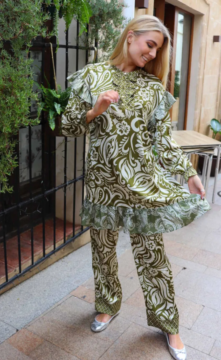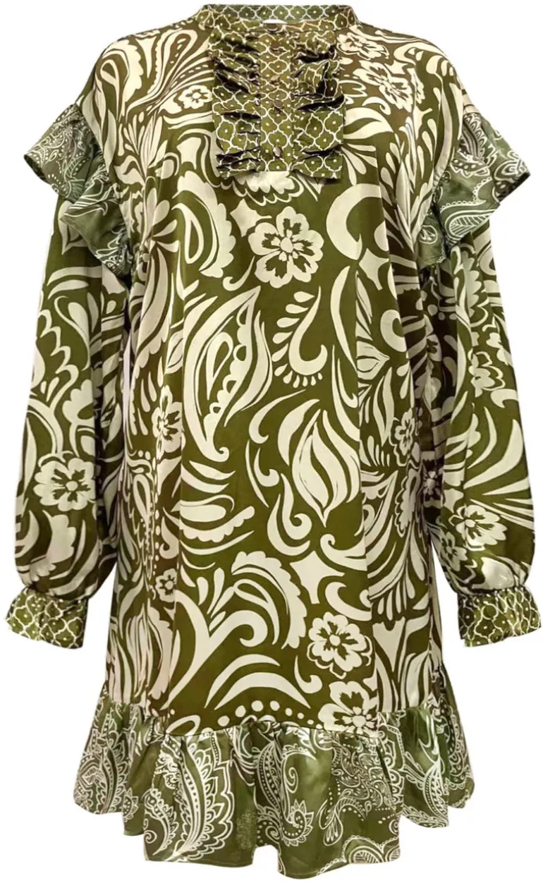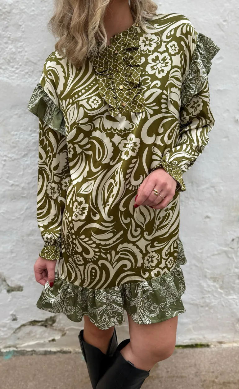 Kjolen går til lige over knæet, og har nogle flotte flæse detajler.