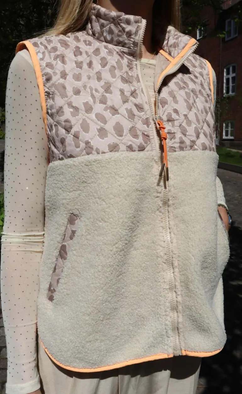 Teddy vest fra Liberte i beige, med leopardprint i toppen og orange syninger.