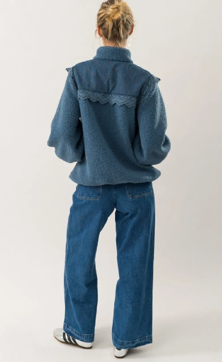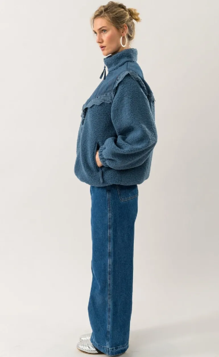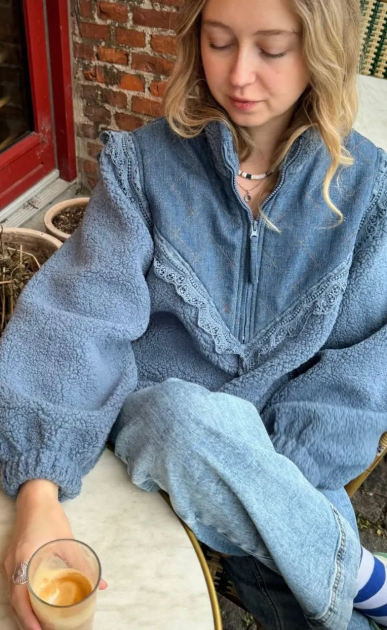 Lækker fleece jakke i en støvet blå jakke.