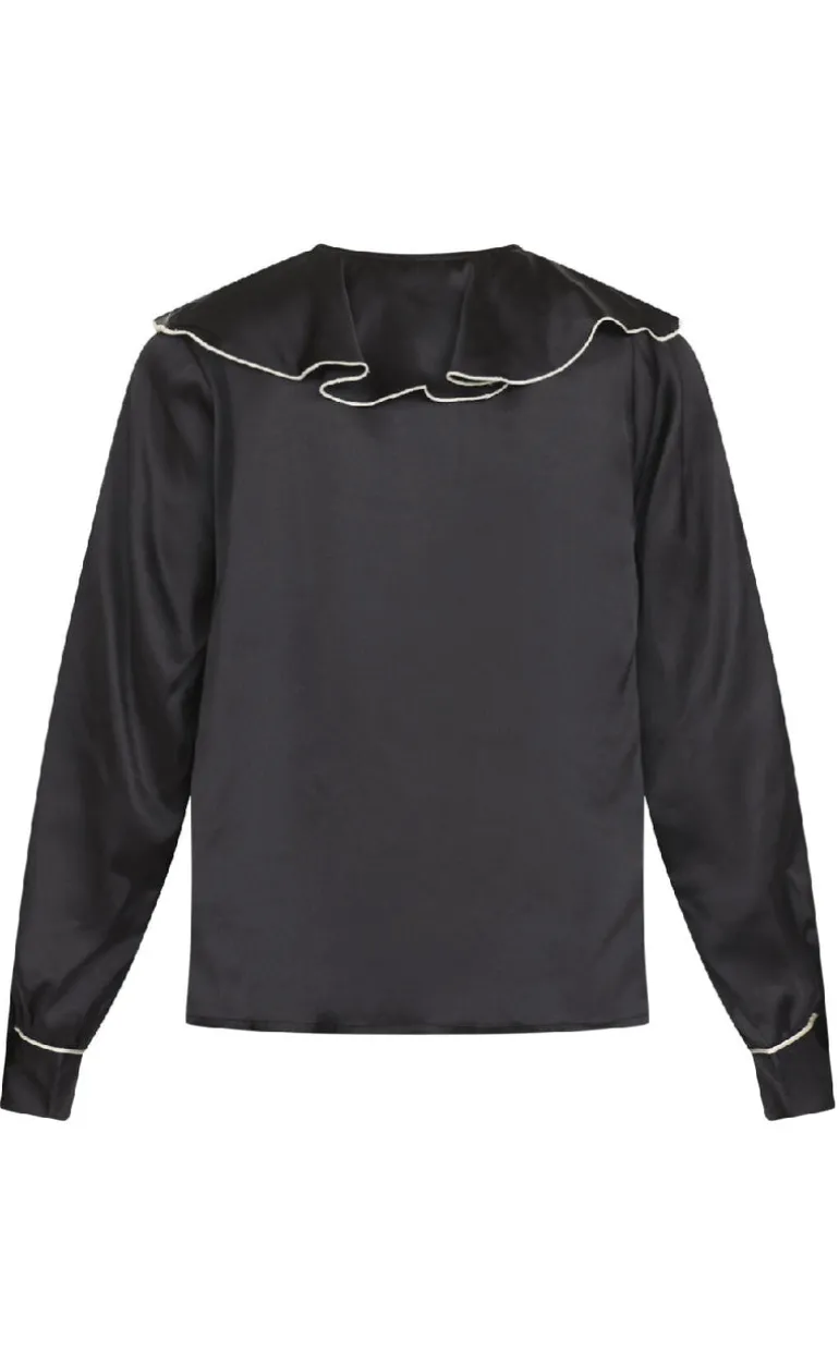 Den fineste satin bluse fra Love & Divine i en sort farve, med creme farvede detaljer.