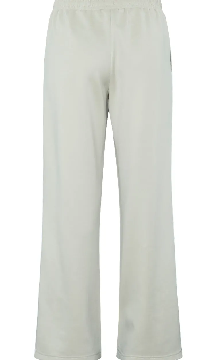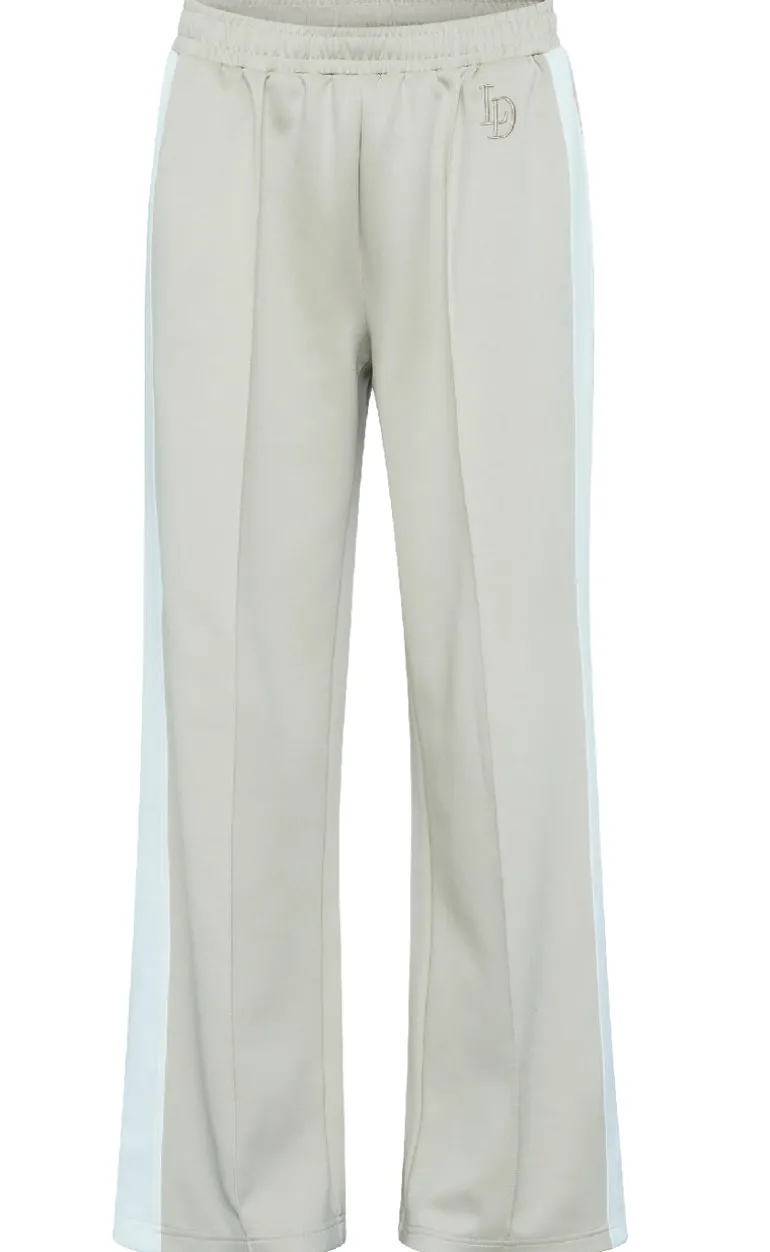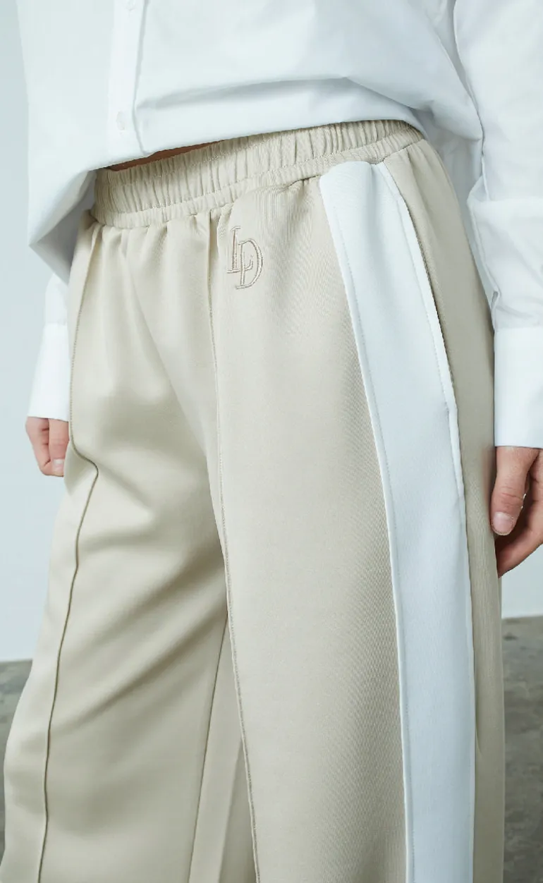 Flotte tracksuit bukser fra Love & Divine i beige, med en hvid stribe ned langs siden.