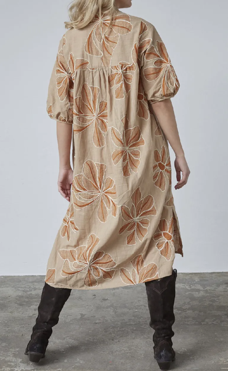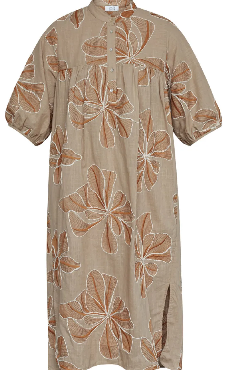 Smuk midi kjole fra Love & Divine i et sandfarvet blomsterprint.