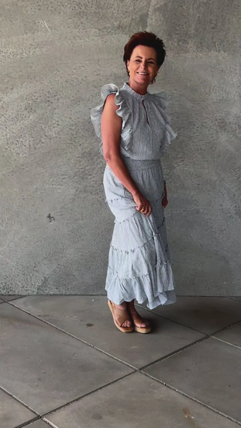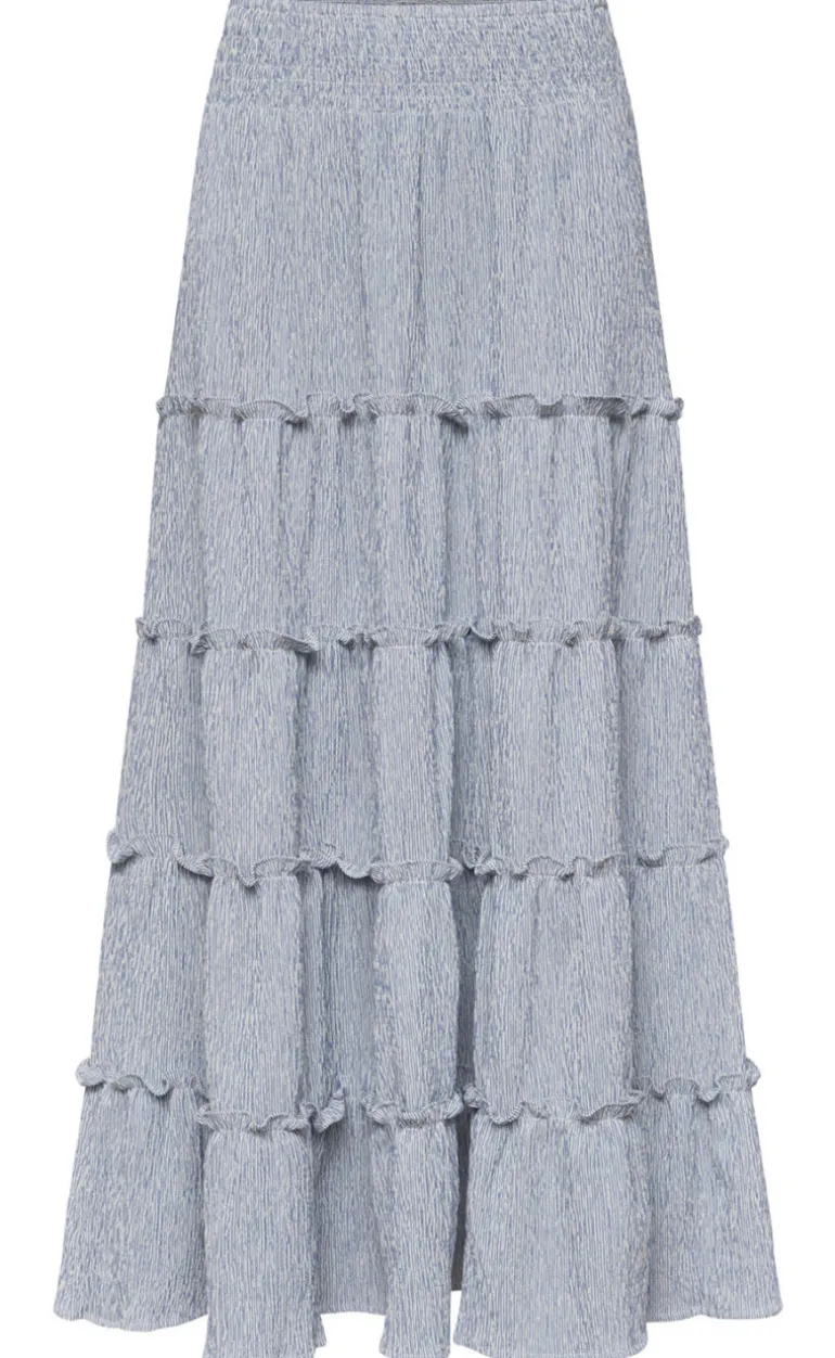 Nederdelen er lang og løs med fine enkelte detaljer.