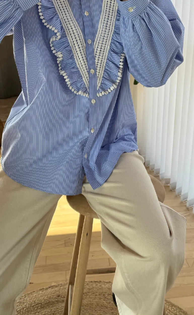 Feminin skjorte fra Love & Divine i blå og hvide nuancer.