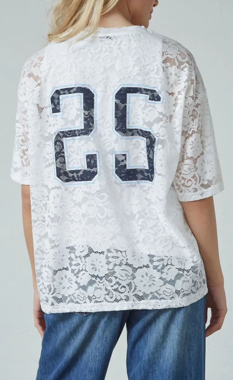Flot og lækker blonde t-shirt fra Love & Divine i hvid, med “25” stående på ryggen.