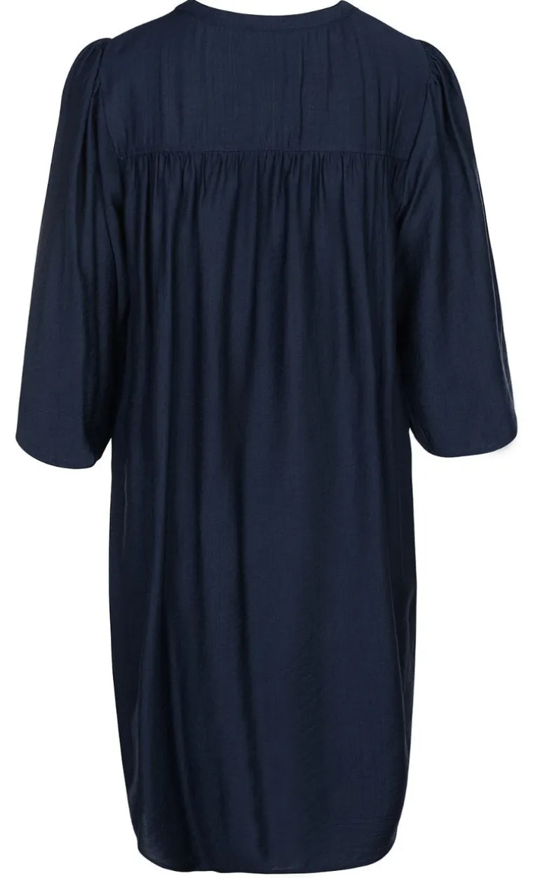 Fin og enkel kjole i navy med detaljer over brystet. En komfortabel kjole til enhver anledning.