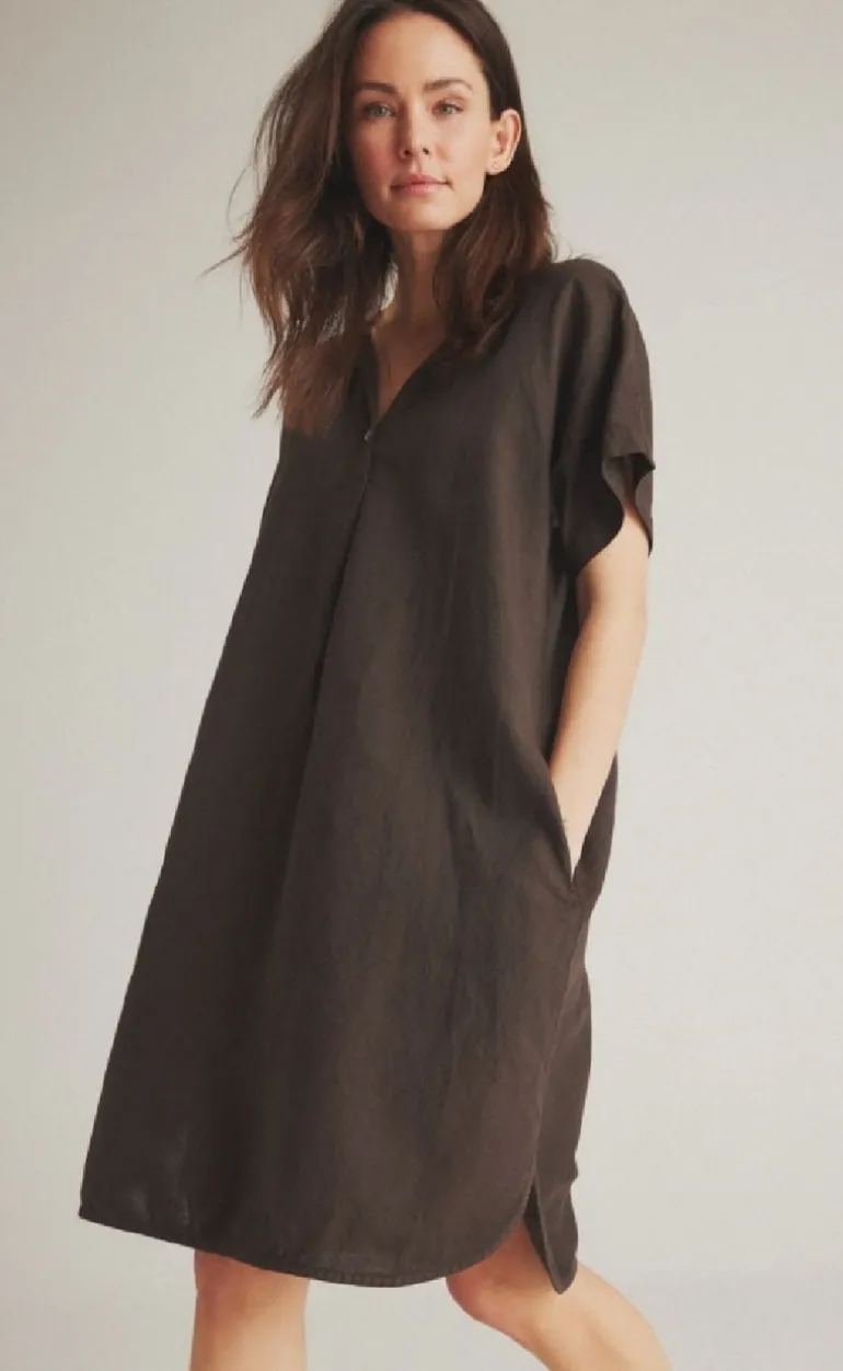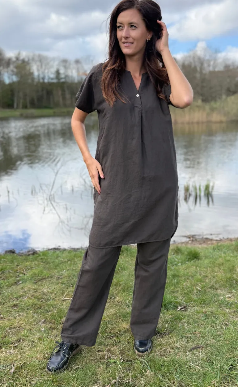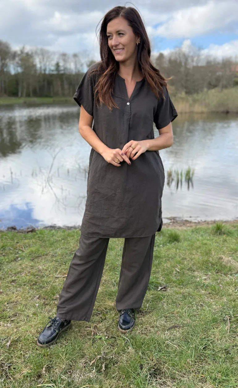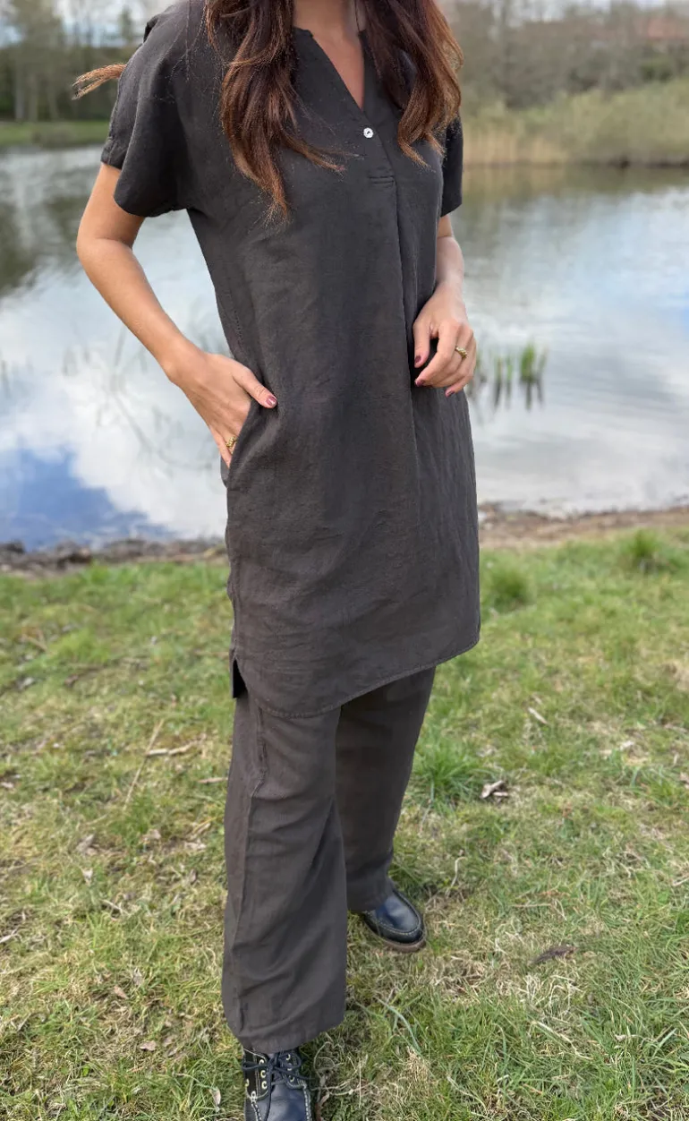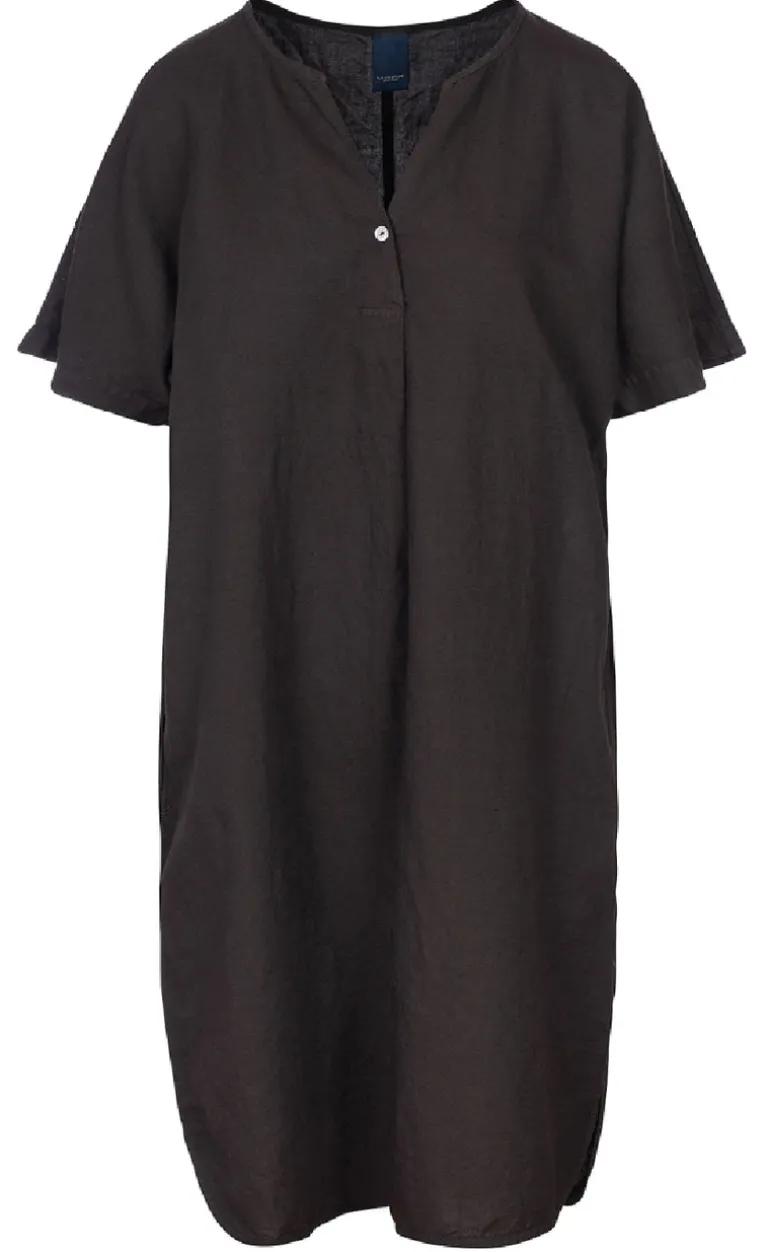 Kjolen har en løs pasform, en v-hals samt korte ærmer.