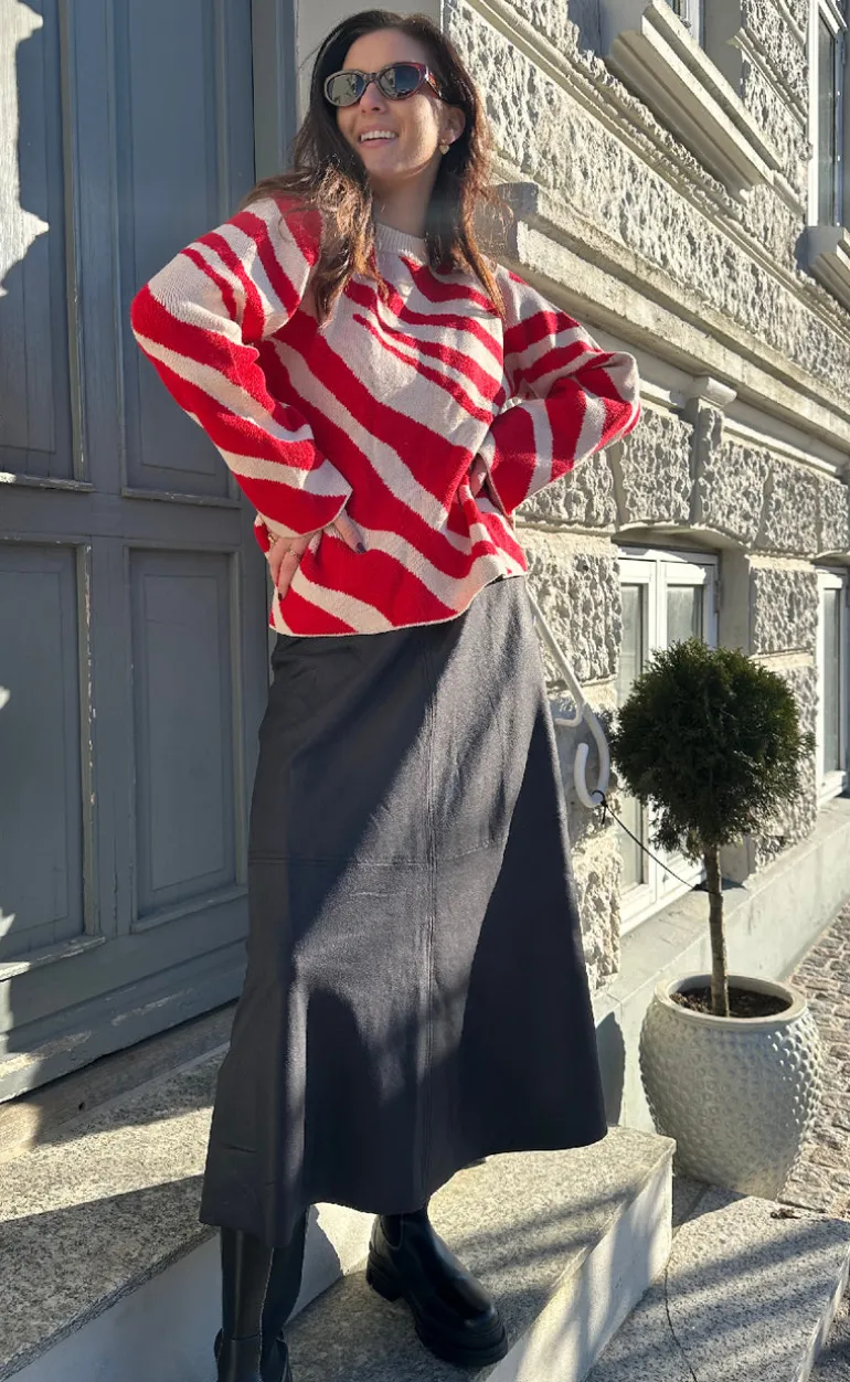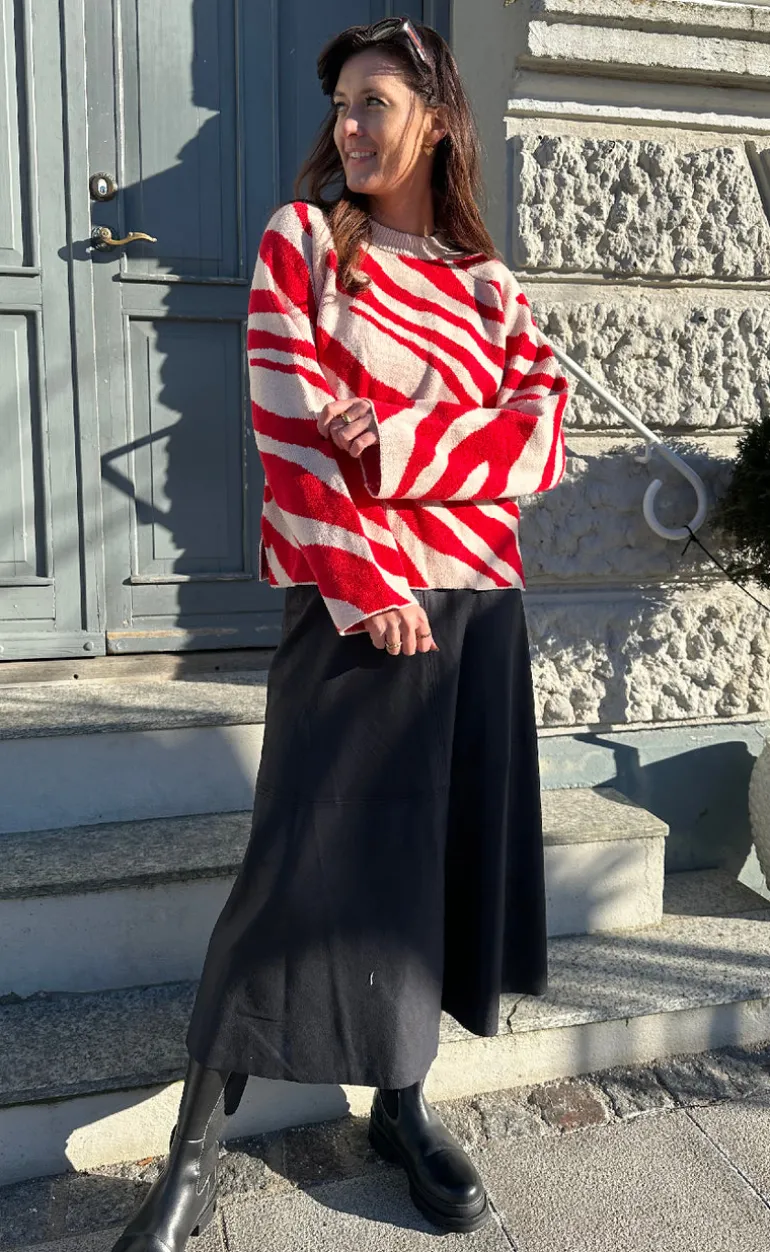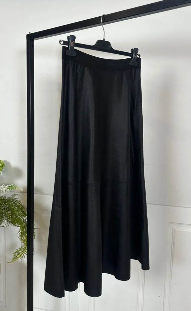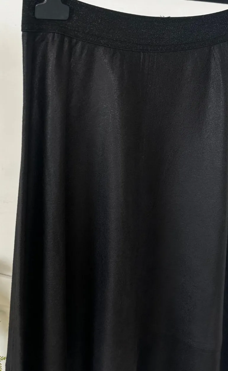 Nederdelen har et bredt metallisk elastikbånd i taljen.
