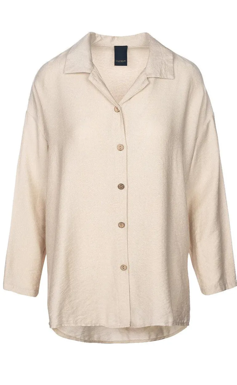 Skjorten er gennemknappet med kokosknapper og har en fin afrunding forneden.