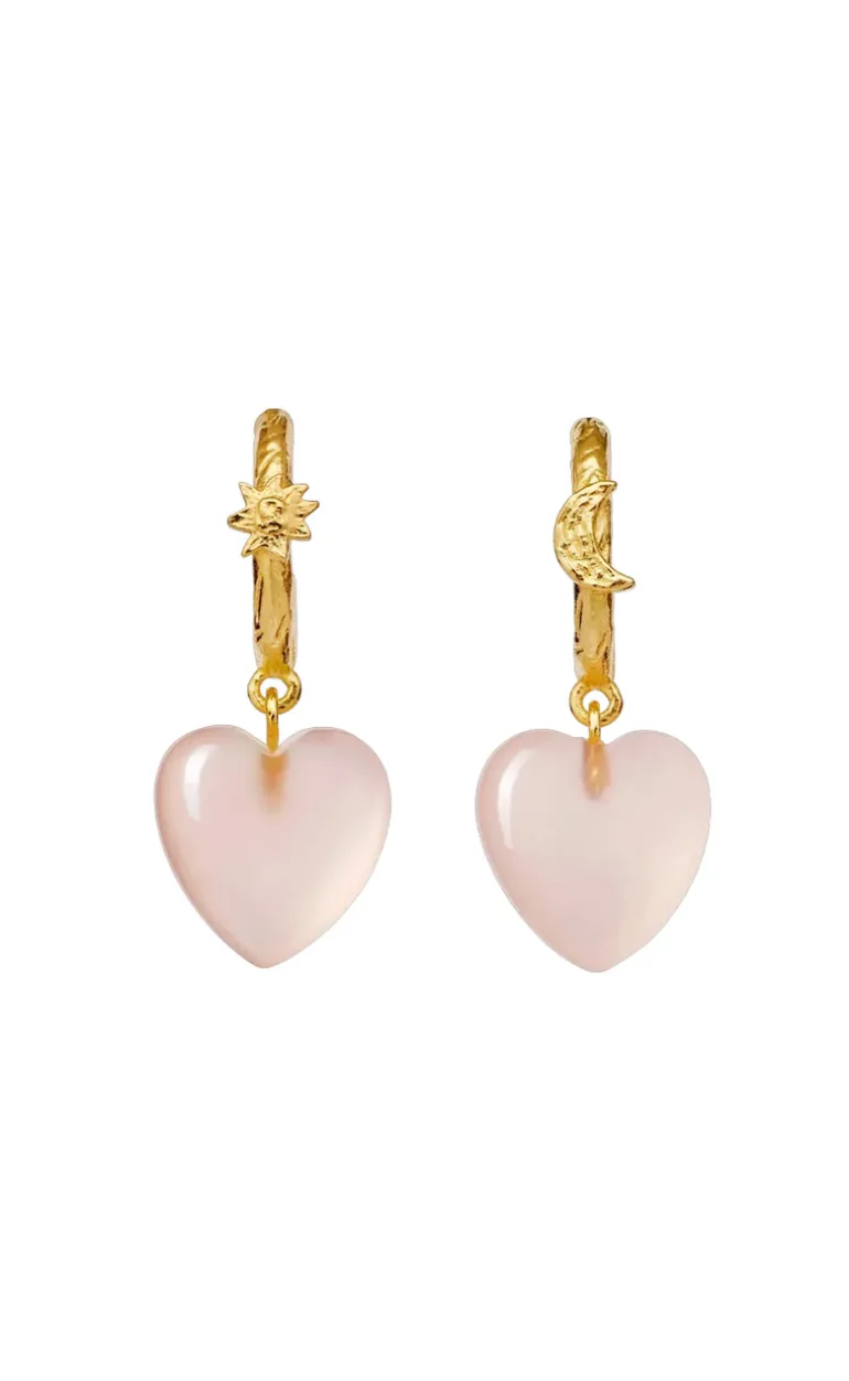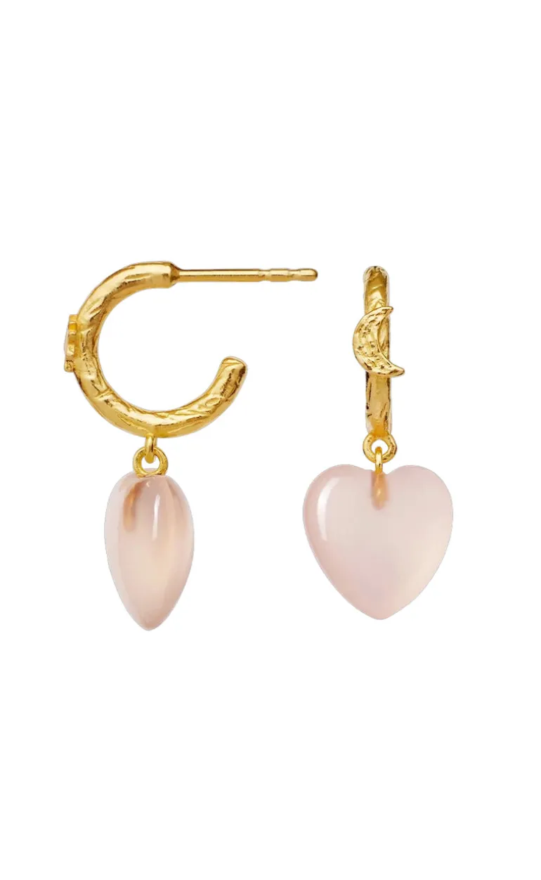 Smukke øreringe fra Maanesten i guld, med lyserøde hjerte vedhæng.