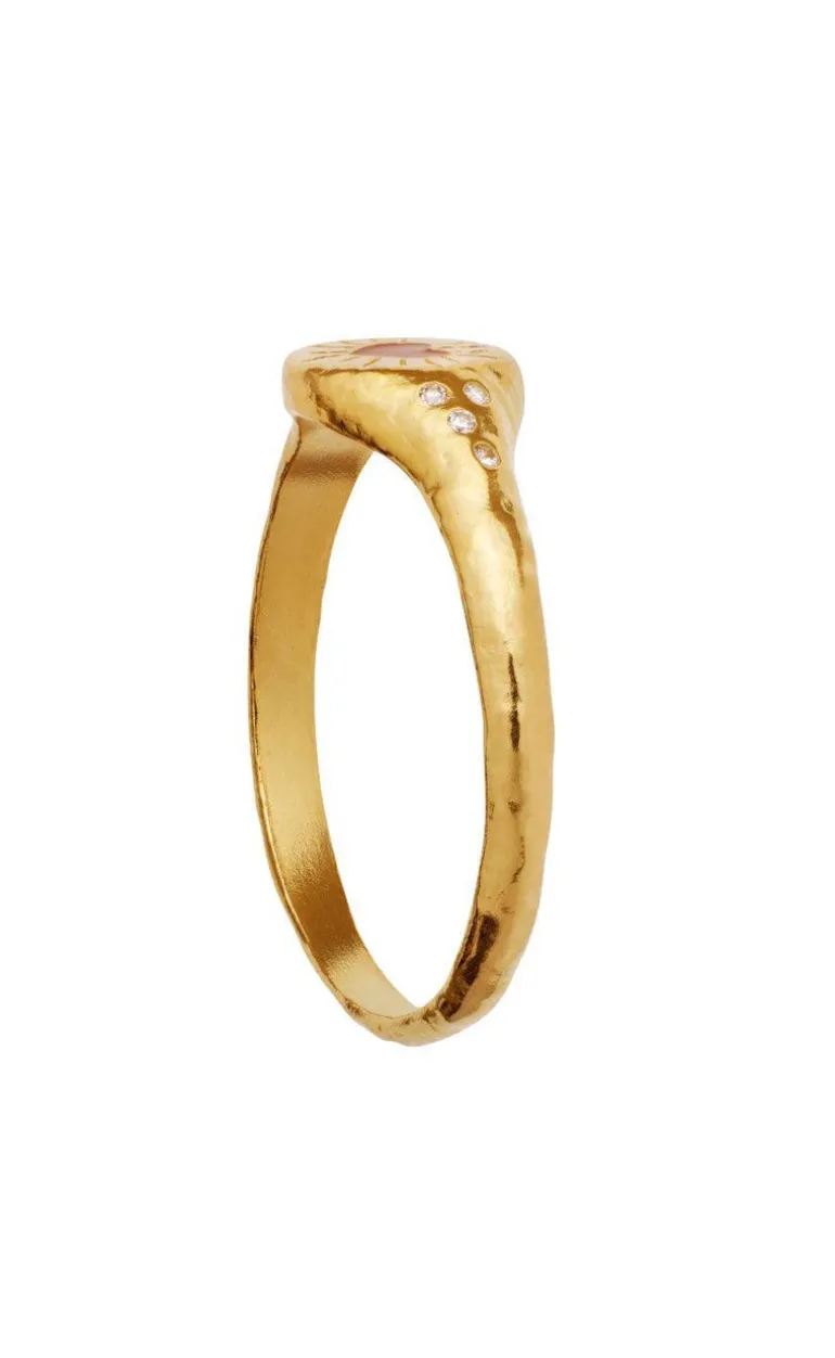 Fin og simpel ring fra Maanesten i guld, med et rødt hjerte i midten.