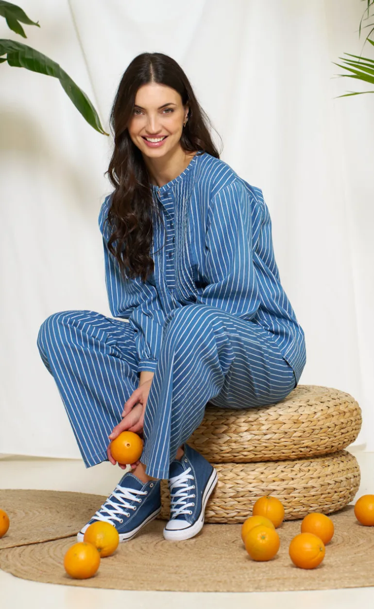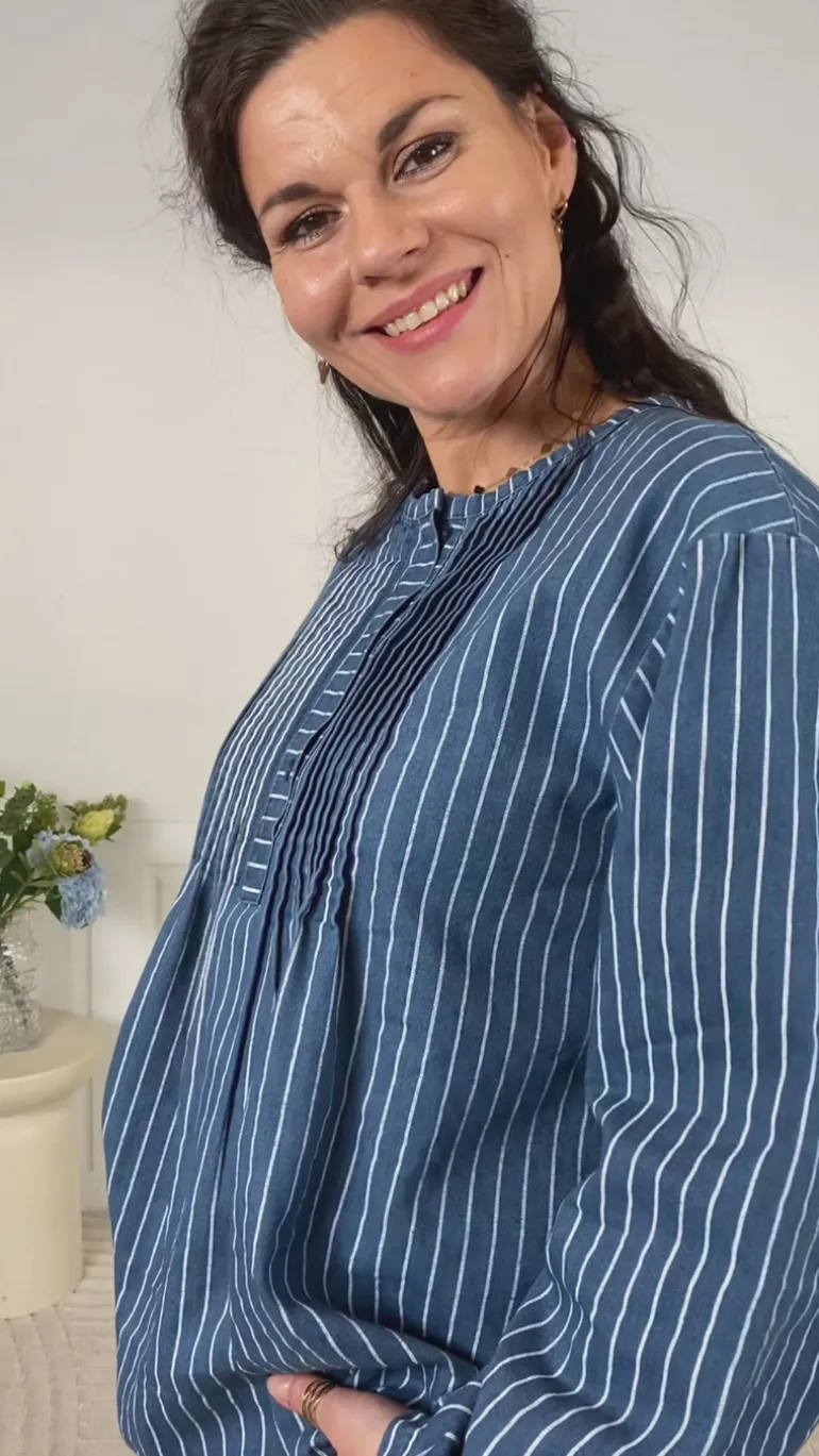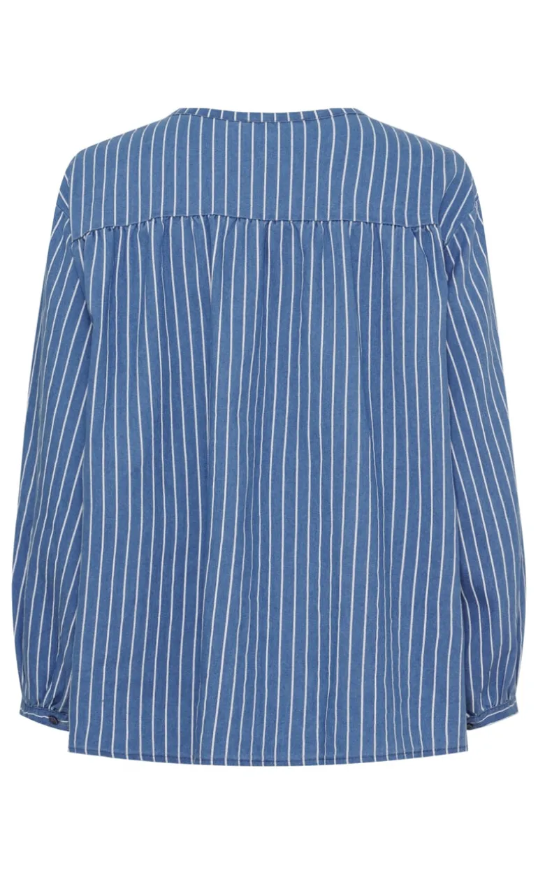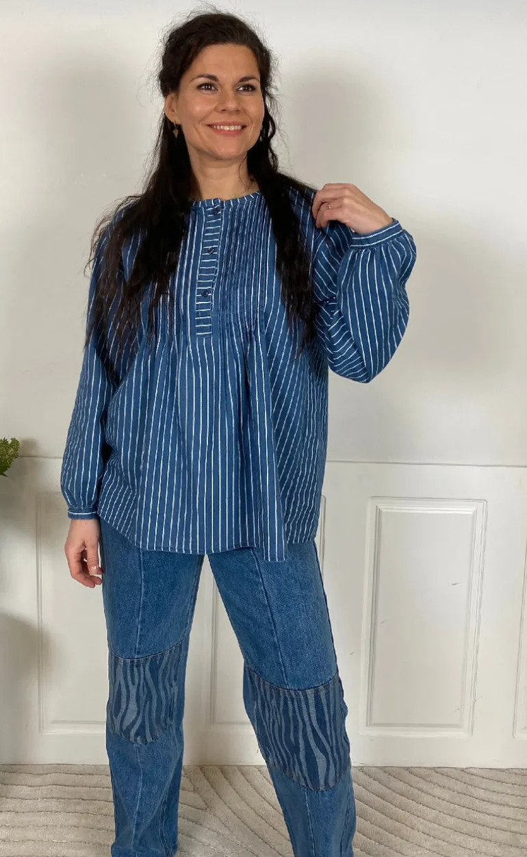 Denne bluse har et riflet matriale ved brystet, og ballonærmer.