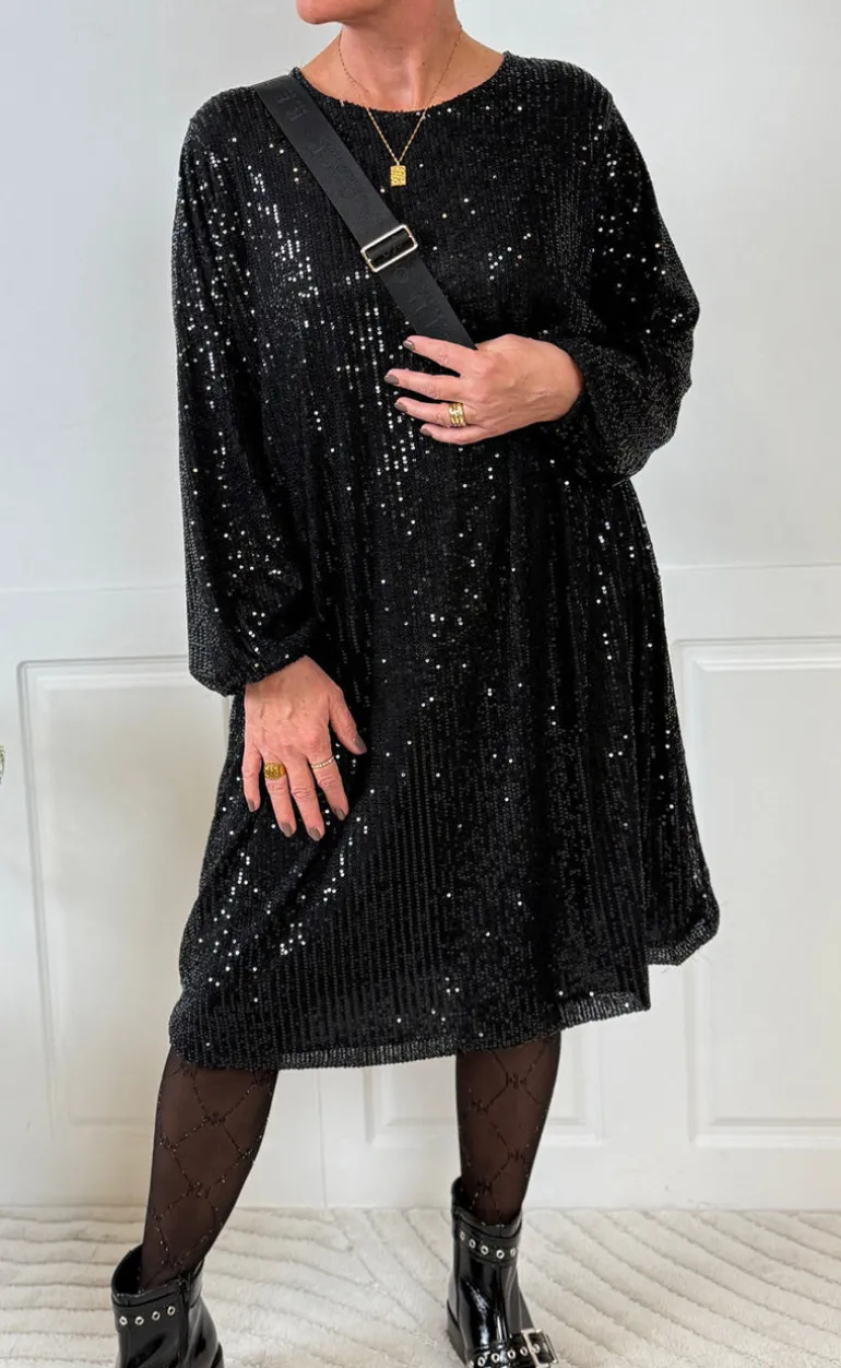 Pæn lang kort kjole. Denne kjole er sort og har palietter.