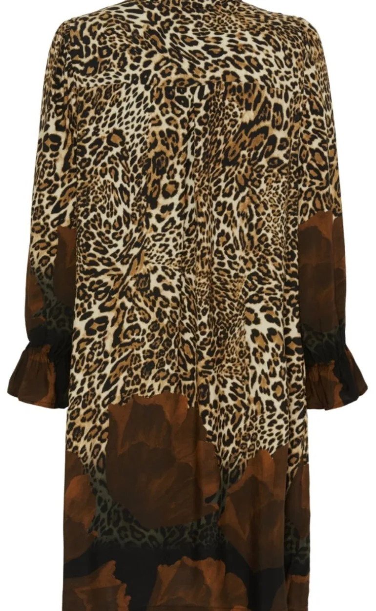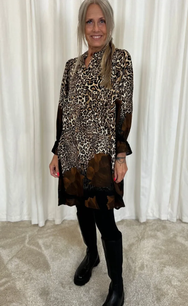 Fin kjole med leopart print og brune blomster forneden.