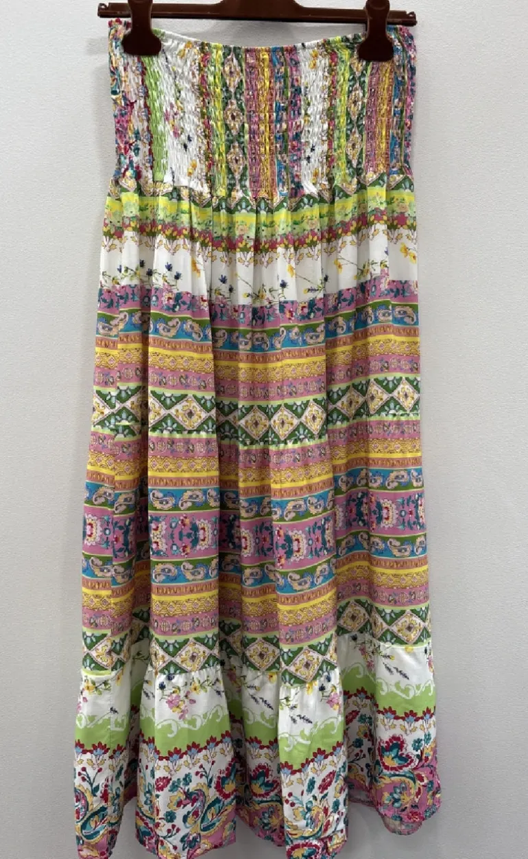 Nederdelen er lang og har en løs pasform. Den har smock detaljer i øverste del, så den er meget behagelig at have på.