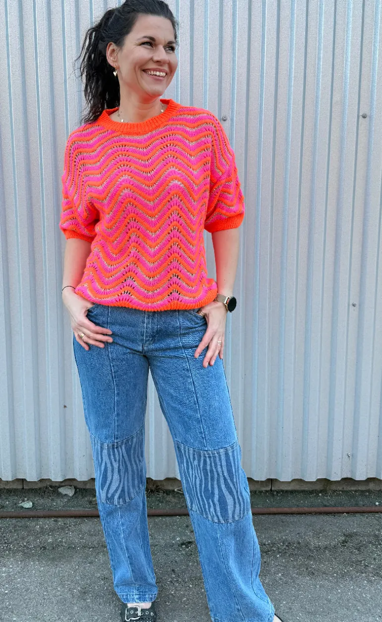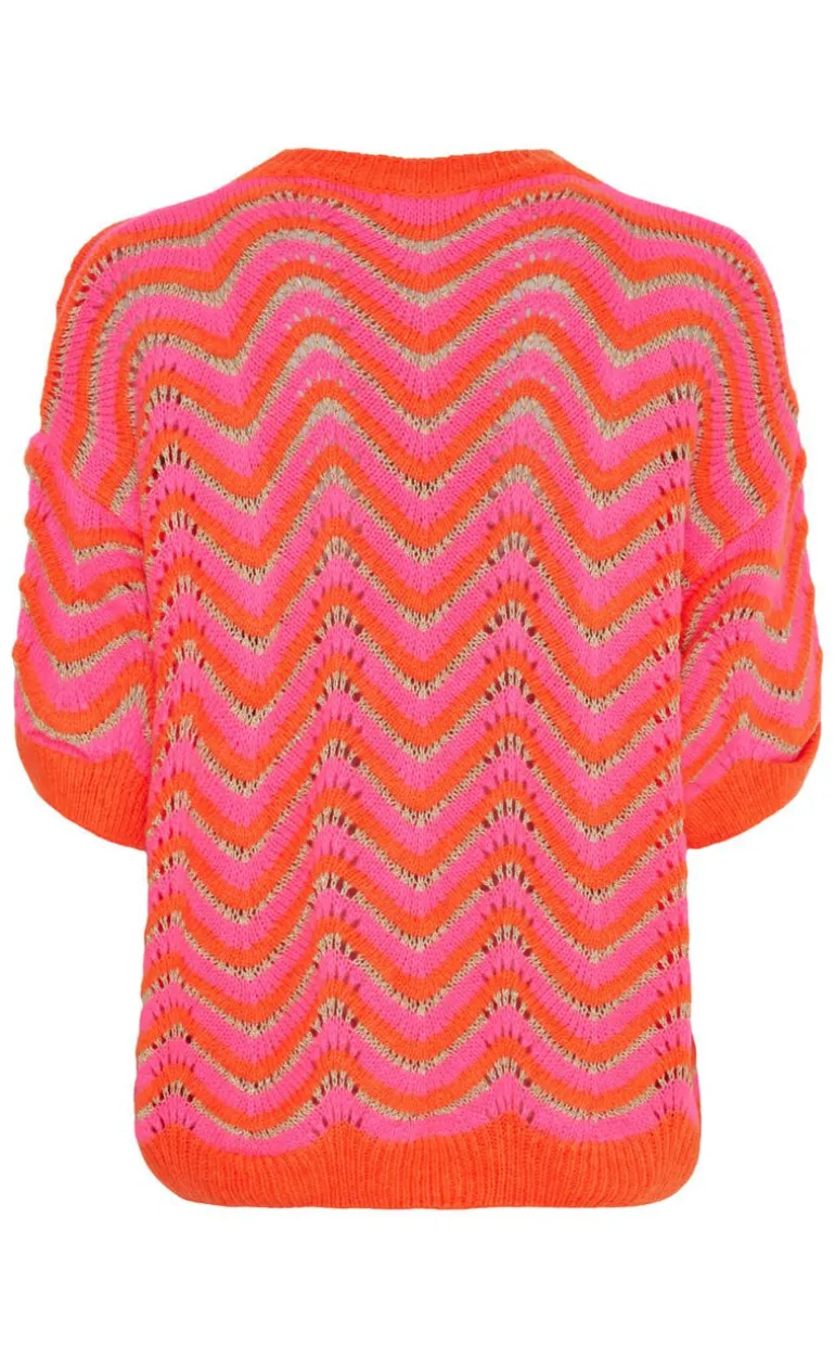 Lækker strik med korte ærmer i orange, pink og guld.