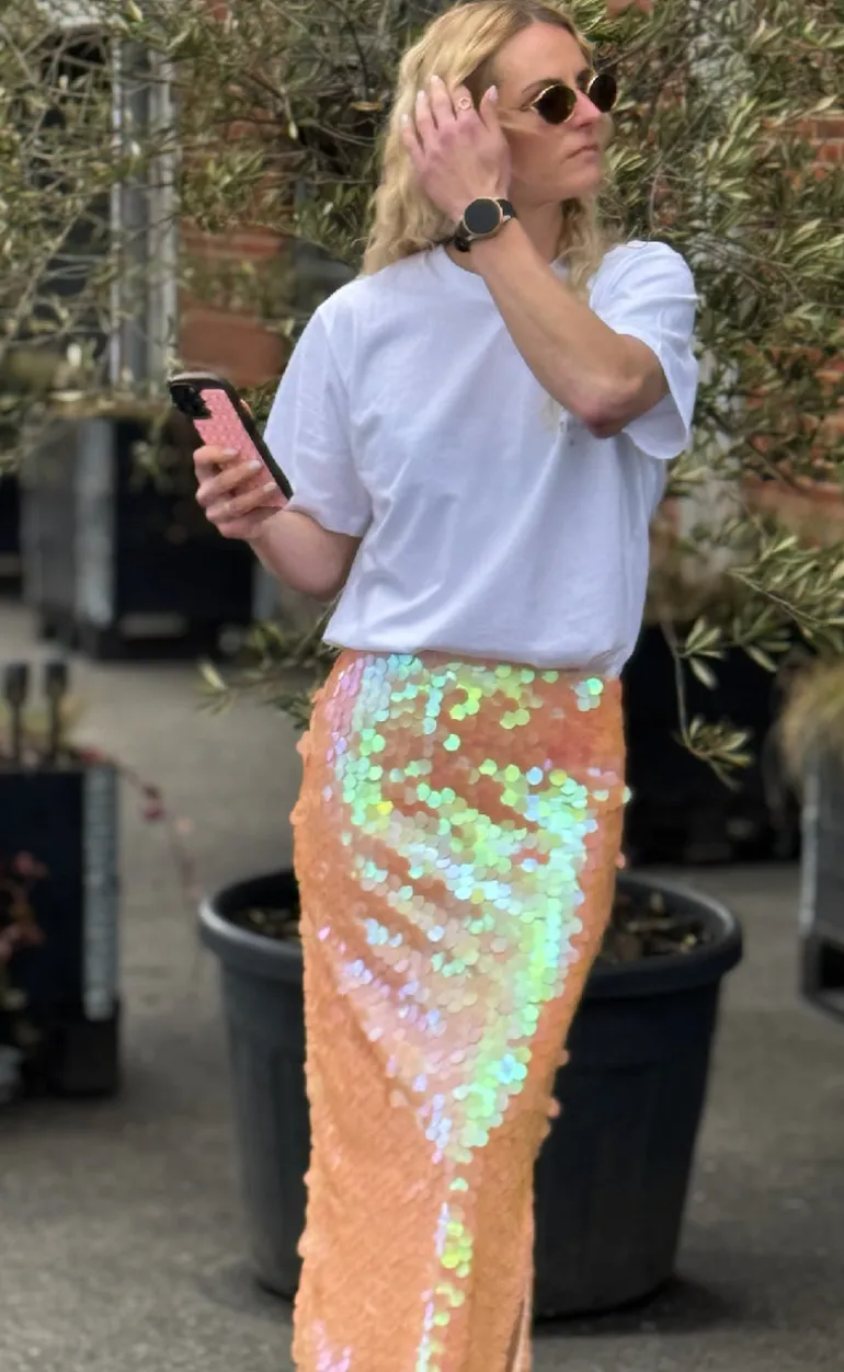 Festlig nederdel fra Moves beklædt med palietter i en coral farve.