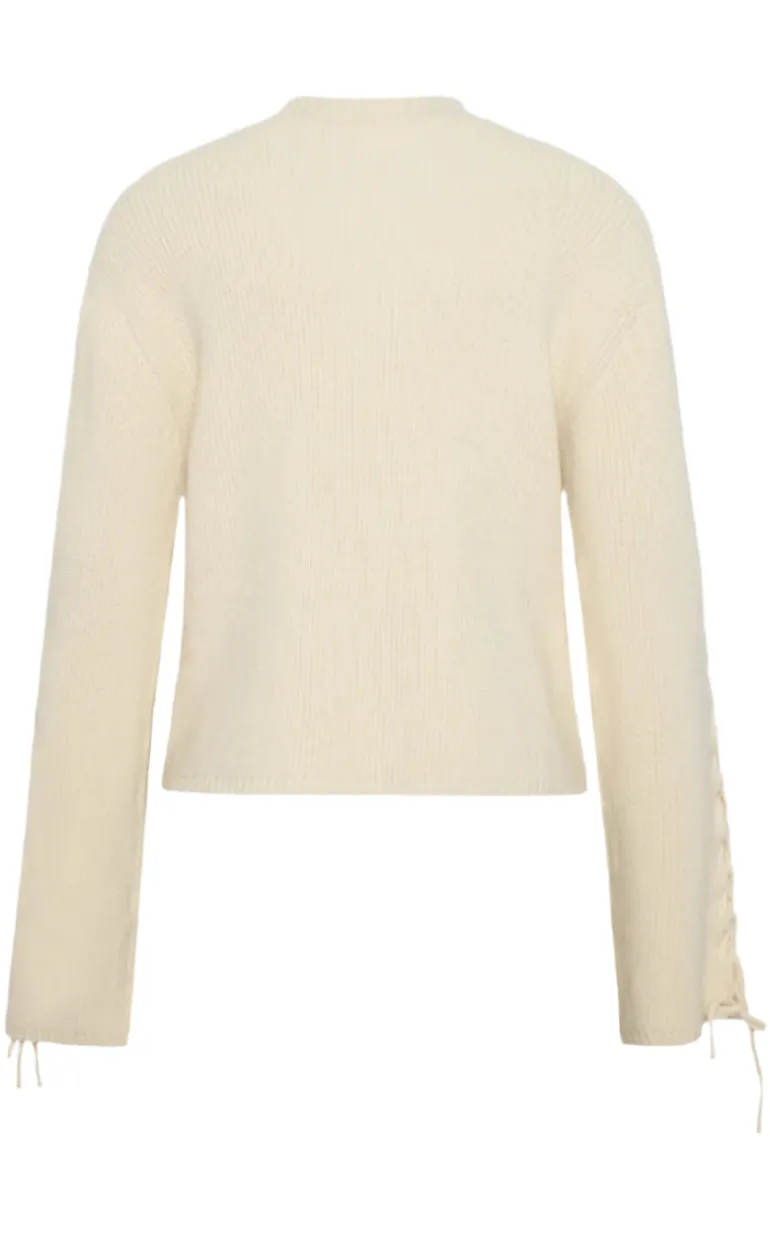 Trendy strik bluse fra Moves i beige, med et ribbet look og bindedetaljer hos ærmet.