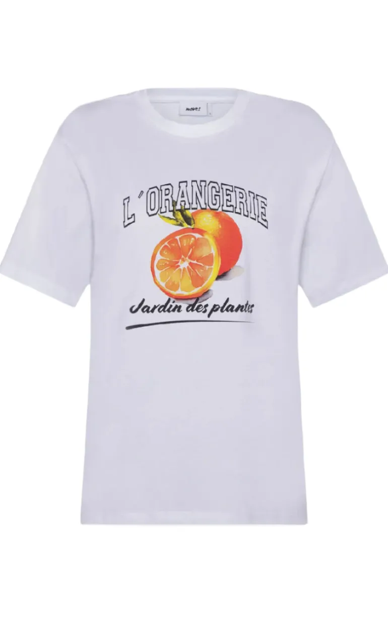 Basic t-shirt fra Moves i hvid, med orange print fortil.