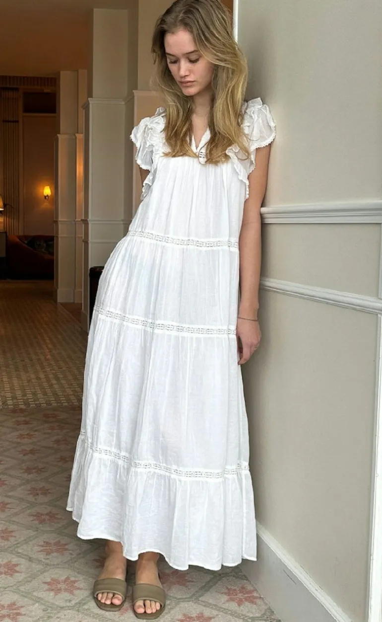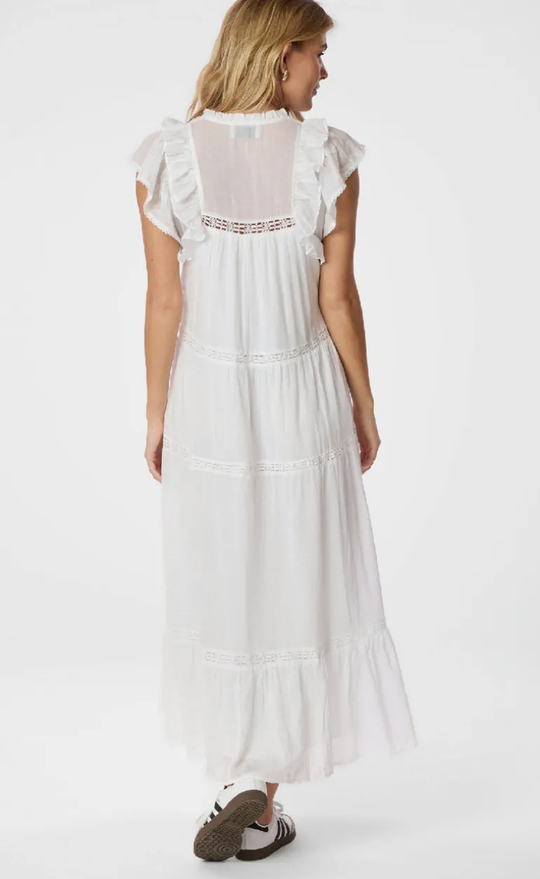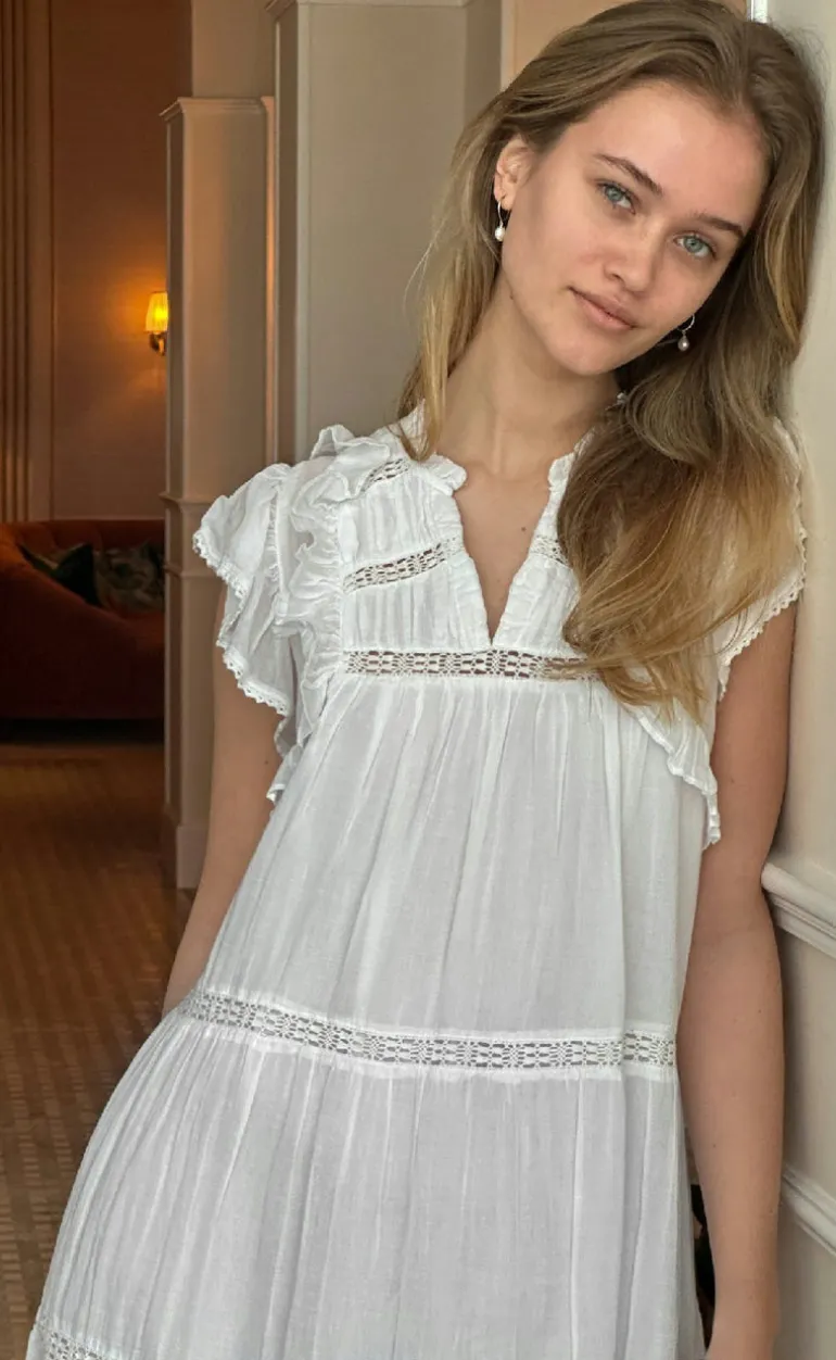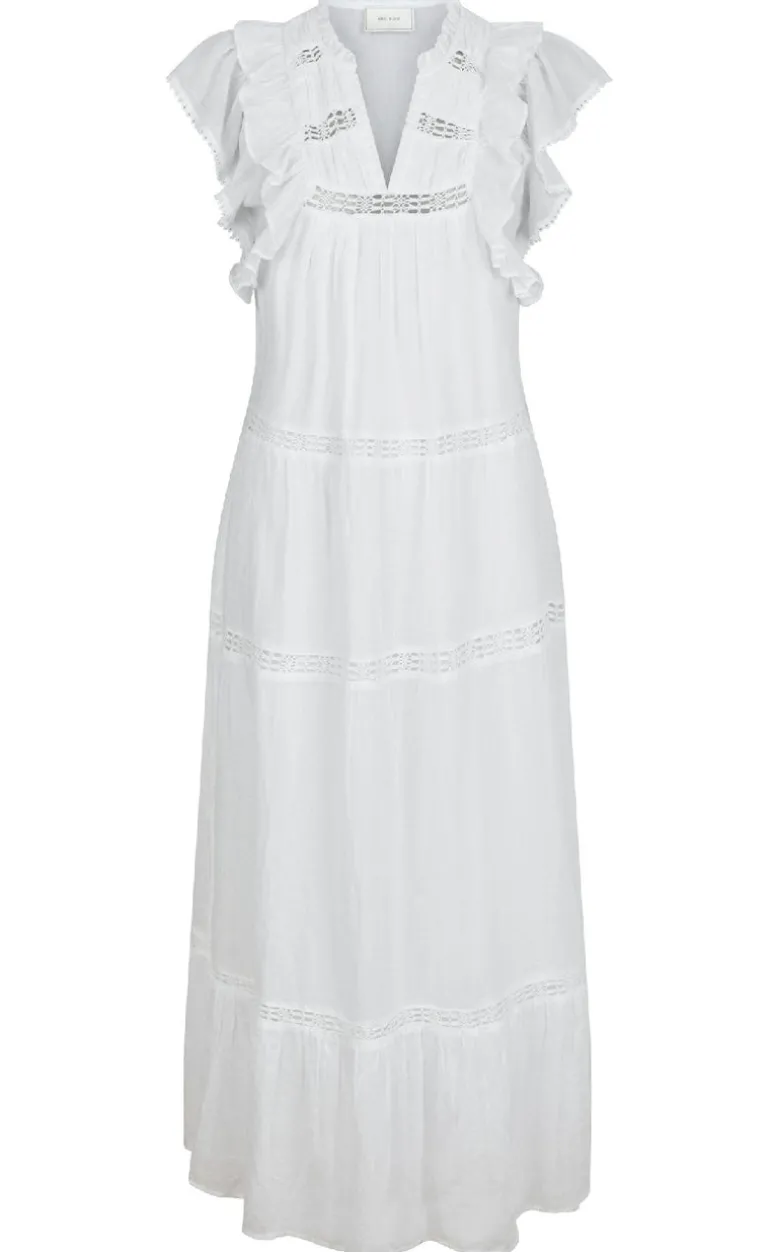 Den smukkeste kjole i hvid fra Neo Noir, fremstillet i en blød bomulds voile med lag i underdelen og broderetbånd detaljer.