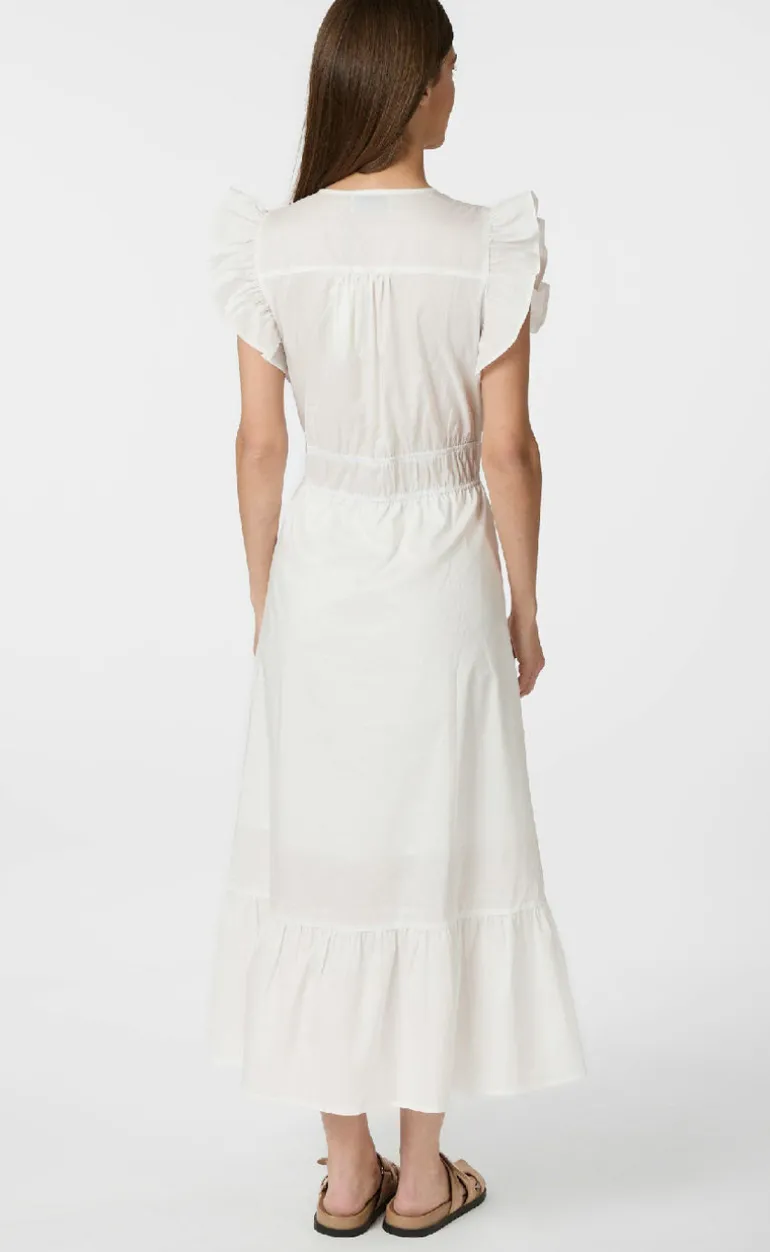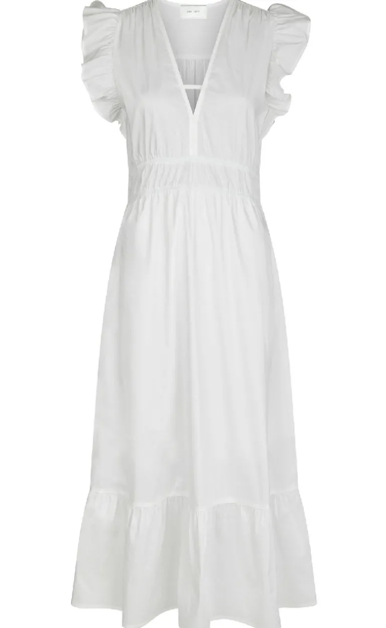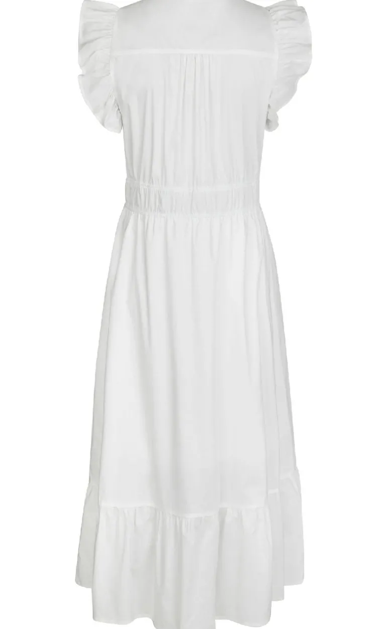 Fin lang kjole fra Neo Noir i hvid, med elastik i taljen. Kjolen har flæsedetaljer ved ærmerne, nederste kant og en v-udskæring.