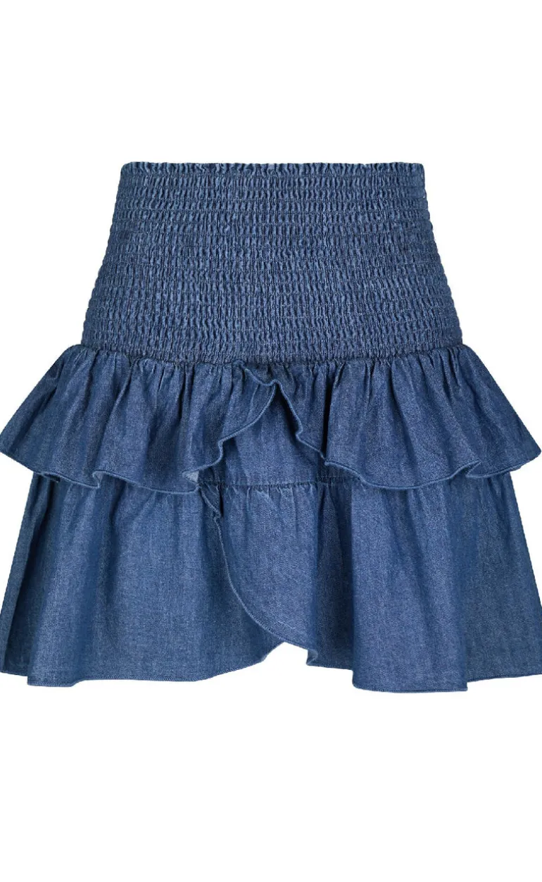 Denne nederdel er kort, med elastik i tajlen og flæser.