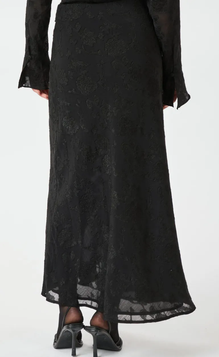 Maxi nederdel med flæse foran fra Neo Noir. Kvaliteten har struktur med et smukt blomster mønster, i en sort nuance.