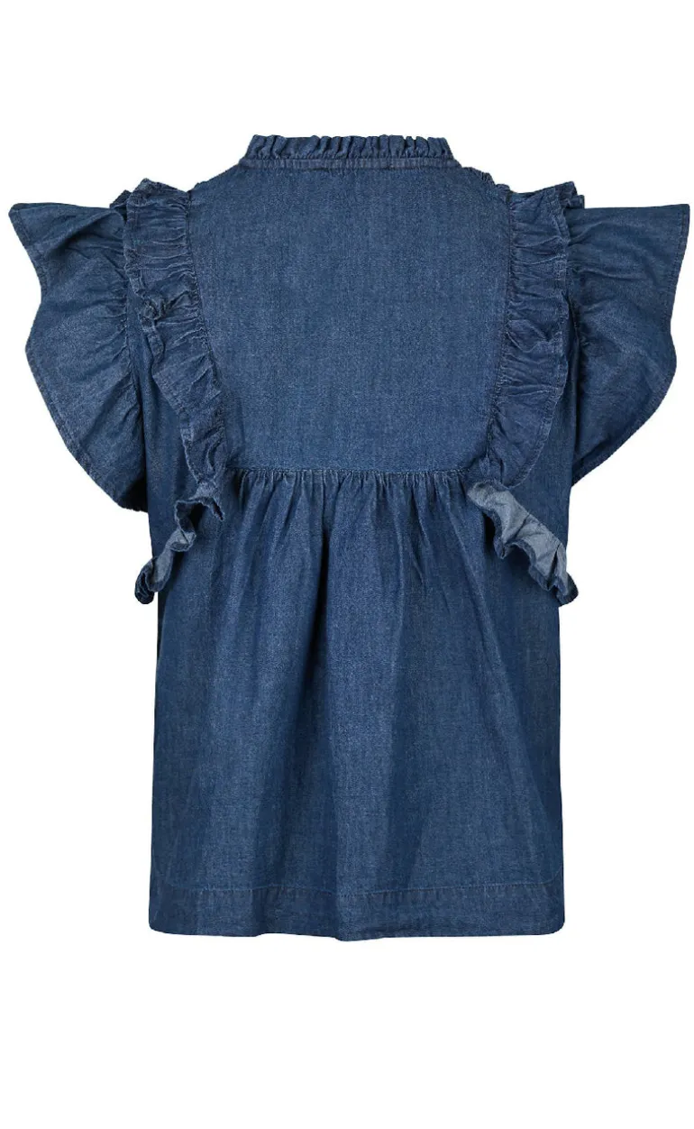 Smuk og populær top fra Neo Noir i blå i en denim kvalitet, med flæser og indsatte bånd.