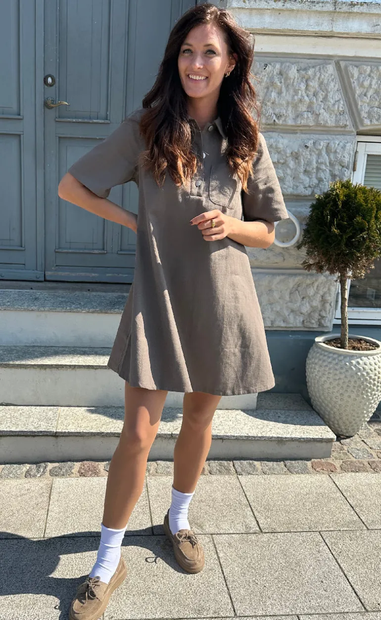 Kjolen har en fin pasform, korte ærmer, krave og knapper foran.