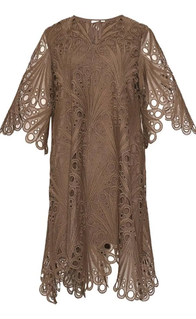 Fin og feminin kjole er brun.