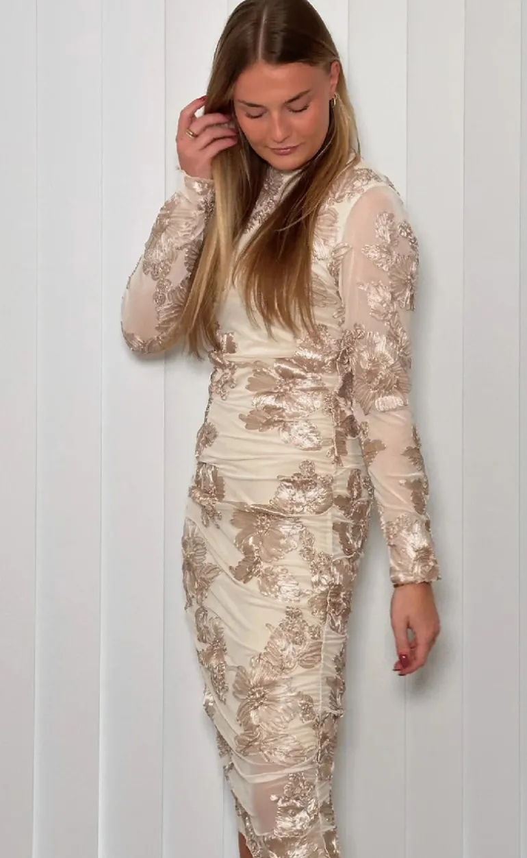 Kjolen har lange ærmer og har et tætsiddende fit.