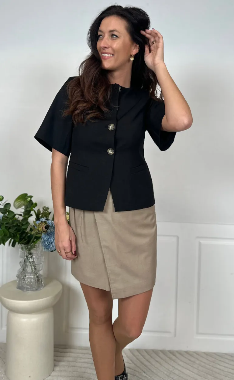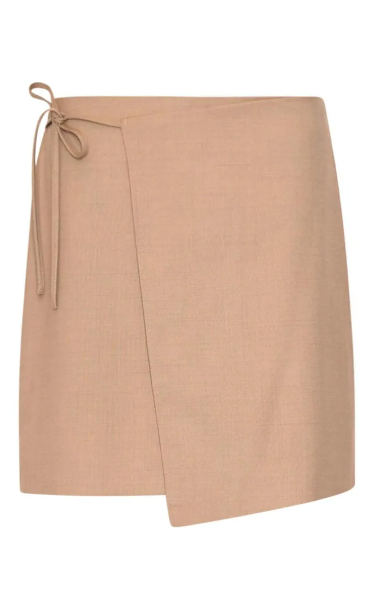 Fin og simpel nederdel i beige, med bindebånd i siden.
