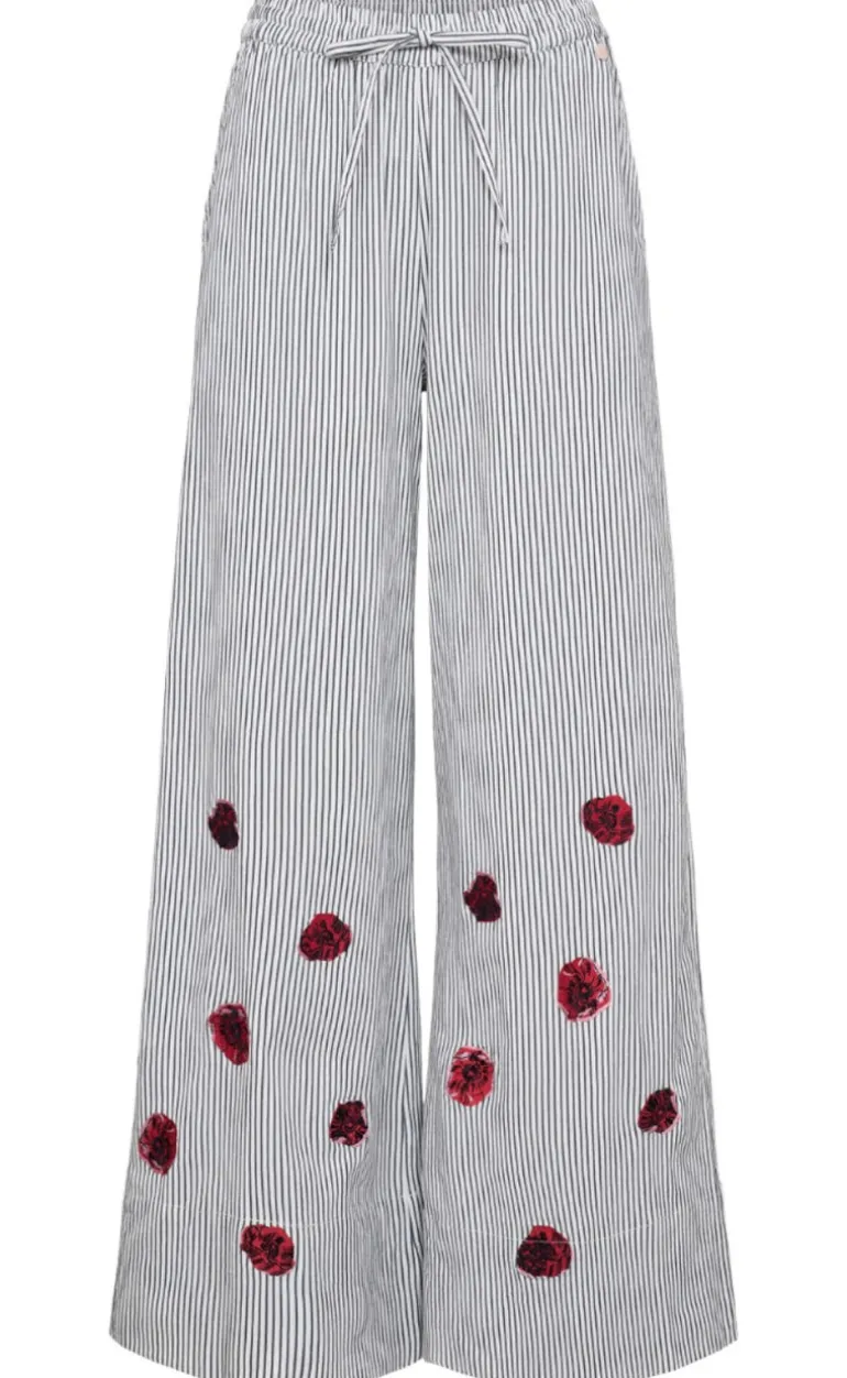 Fede bukser fra Nümph i et blå stribet print, med roser forneden.