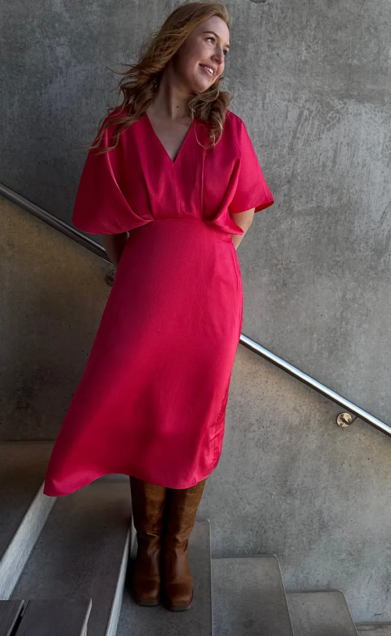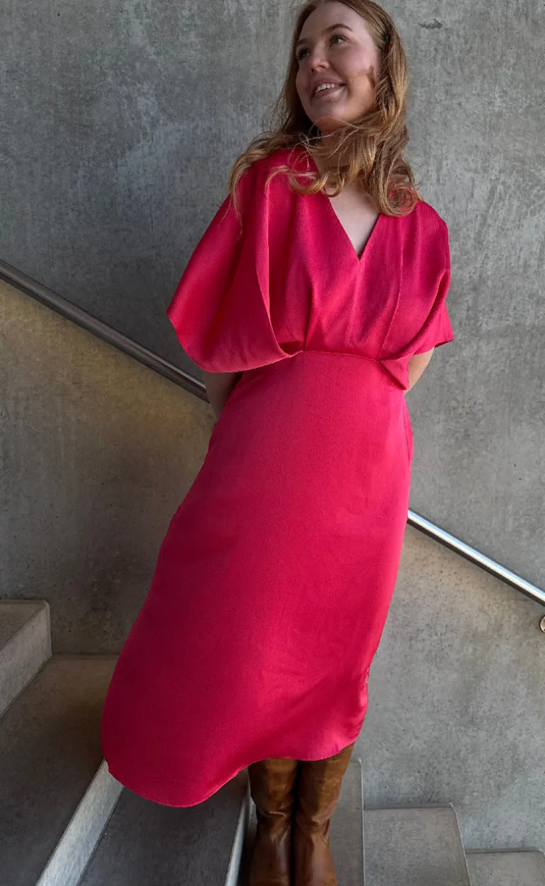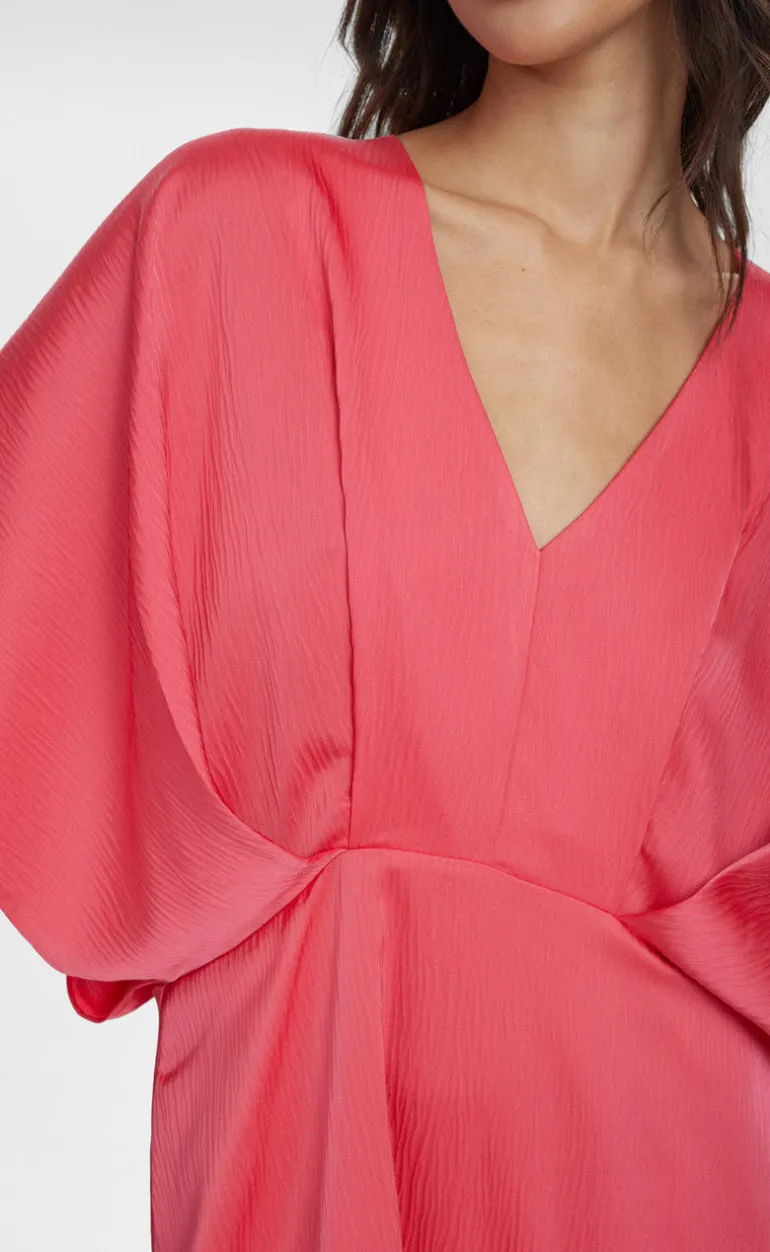 Feminin kjole fra Nümph i lyserød, med e v-hals samt voloumiøse ærmer.