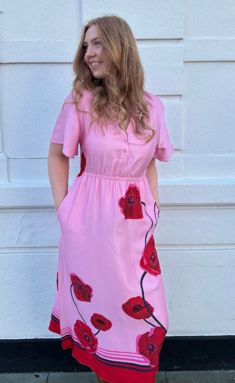 Sød og feminin kjole fra Nümph i lyserød med røde detaljer.