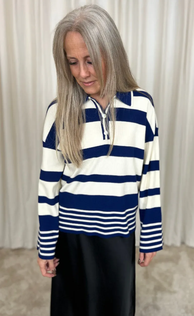 Polo pullover fra Nümph i et blåt og hvidt stribet print.