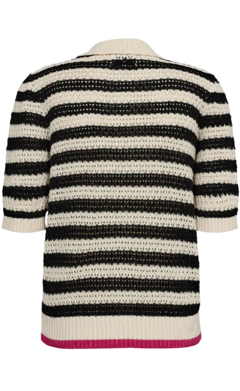 Kortærmet strikbluse fra Nümph i et sort og hvid stribet print, med en lyserødt kant forneden.