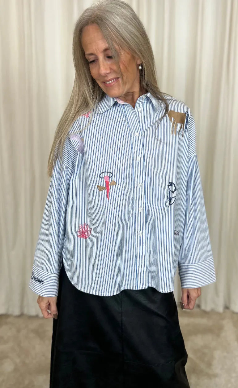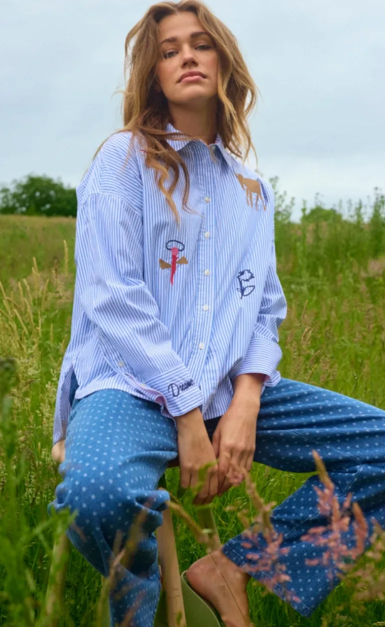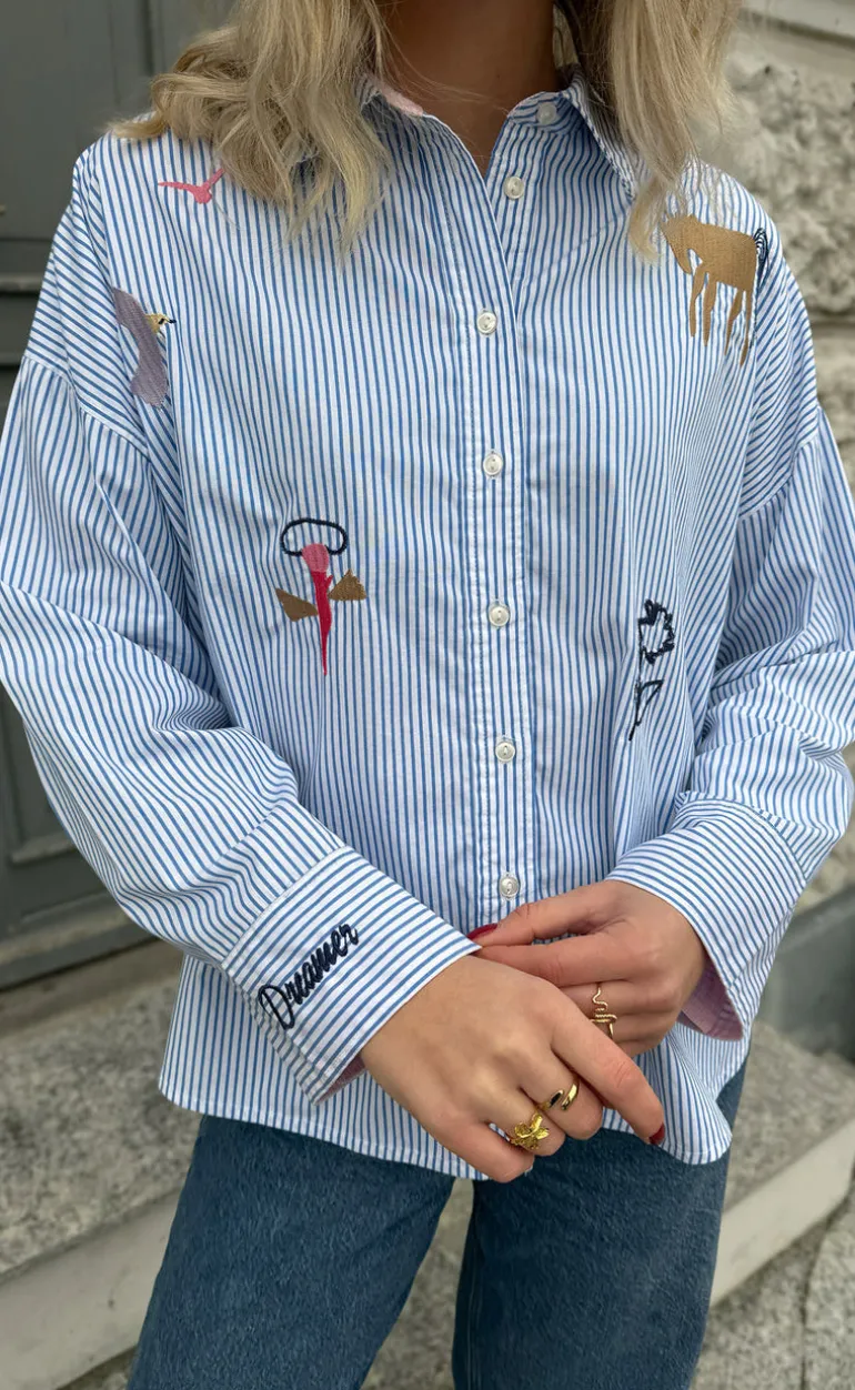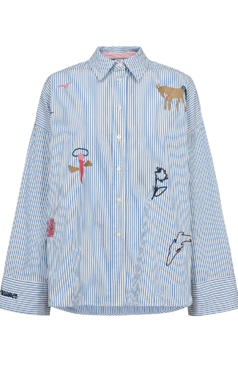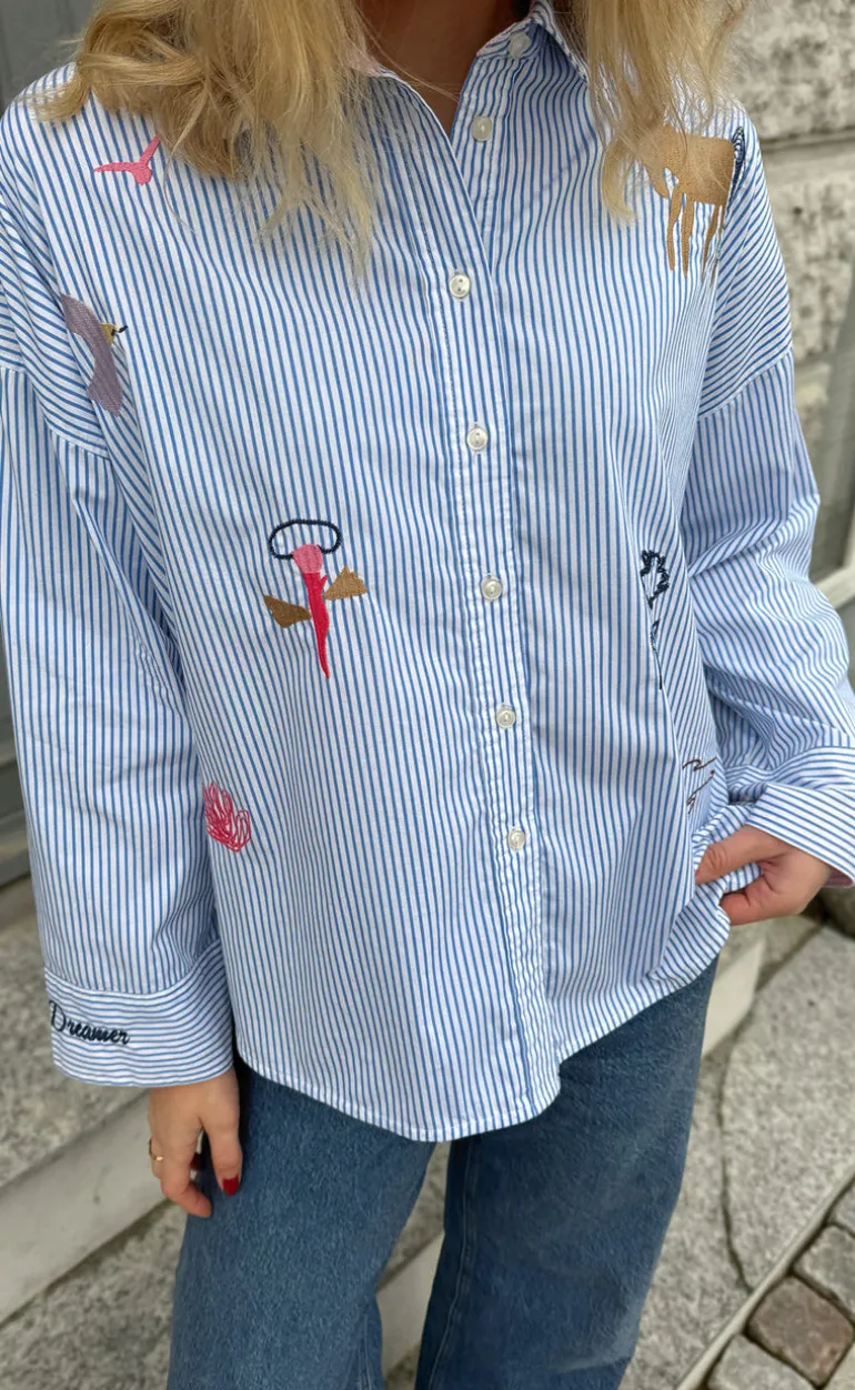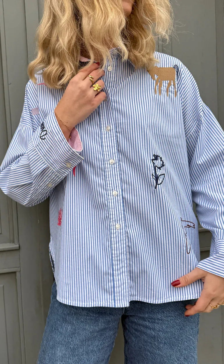 Skjorten har mange finde motiver fordelt rundt på skjorten.