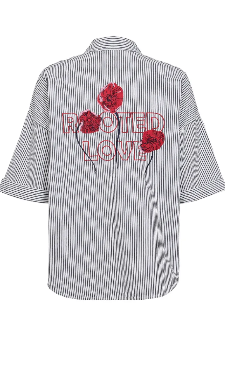 Sød skjorte fra Nümph i et blå stribet print, roser på brystlommen samt det unikke motiv på ryggen.