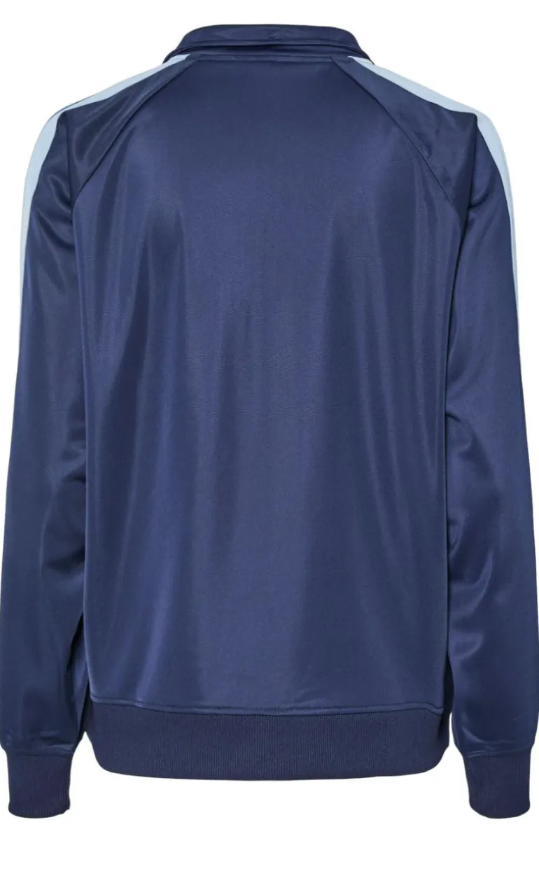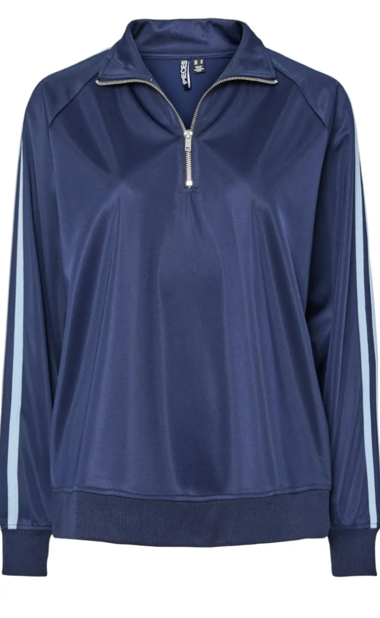 3/4 zip bluse fra Pieces i blå med hvid stribe langs ærmet.