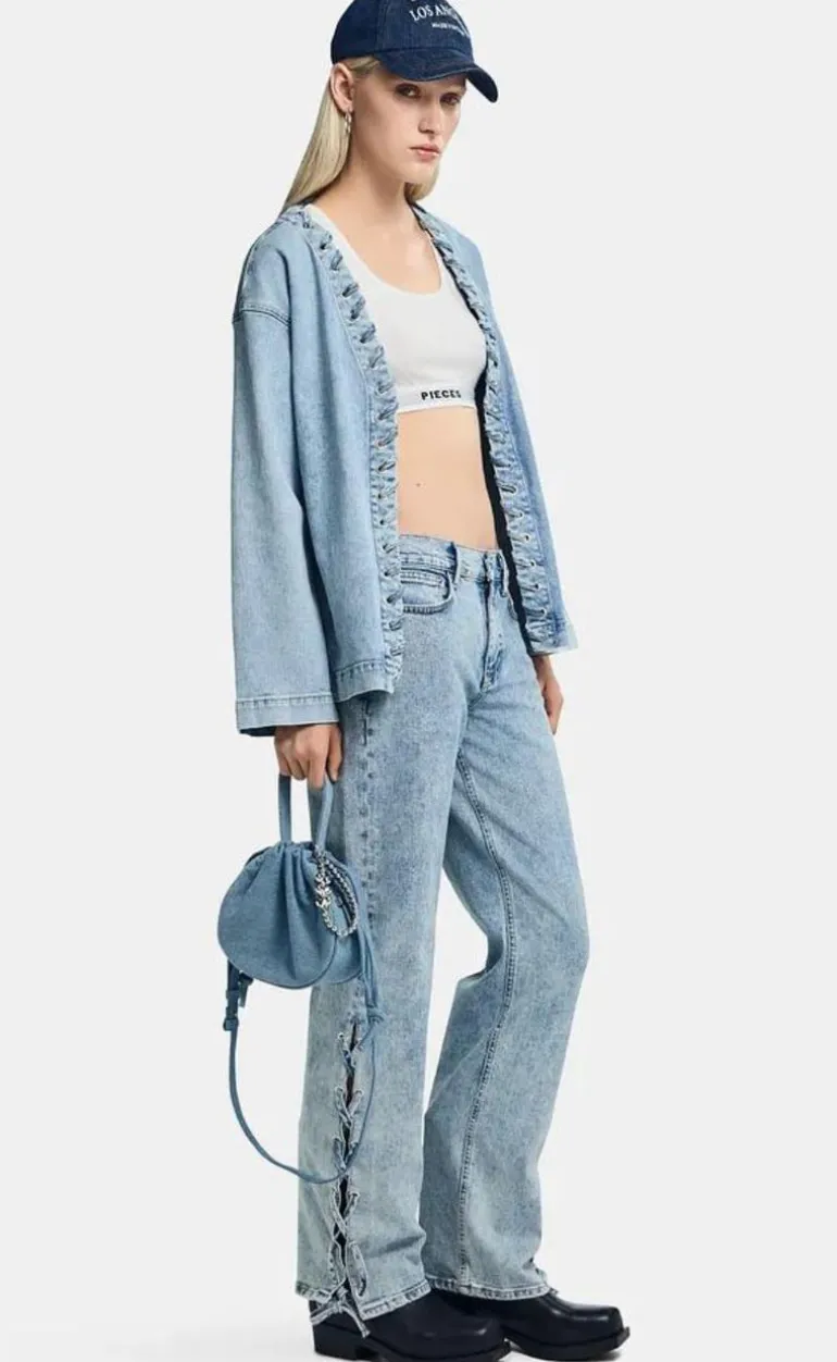 Fin denim jakke fra Pieces i lyseblå. Jakken er åbenstående.