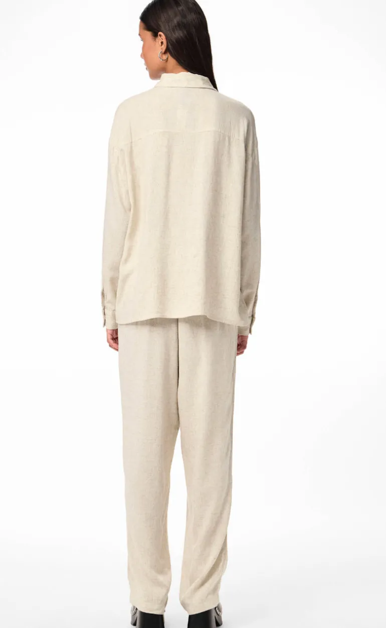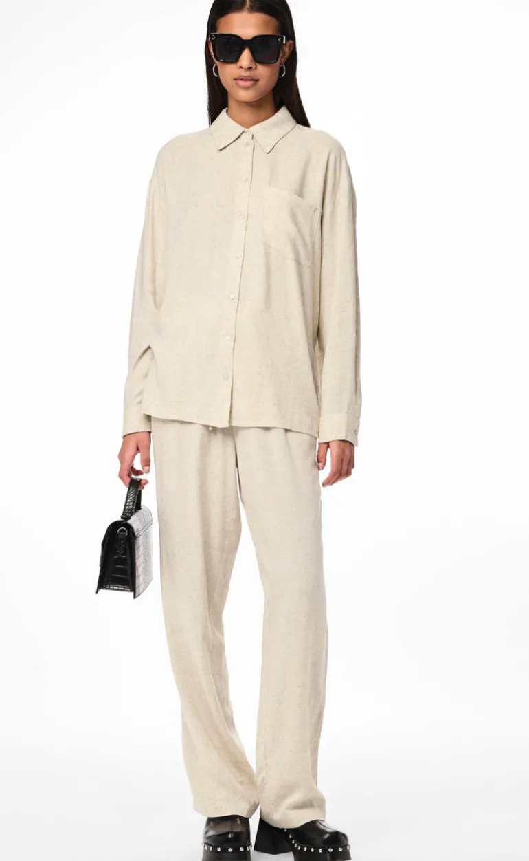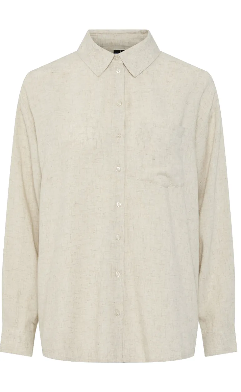 Skjorten har lange ærmer, er gennemknappet samt har en enkelt brystlomme.
