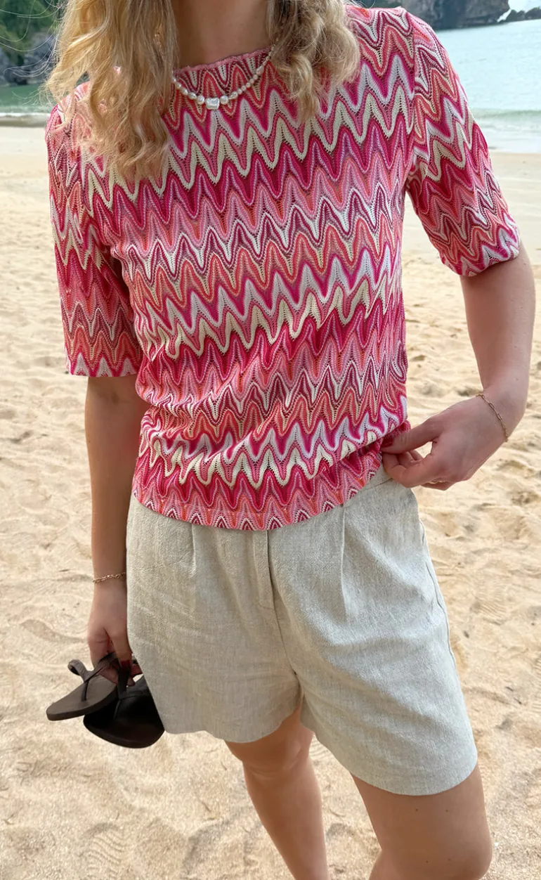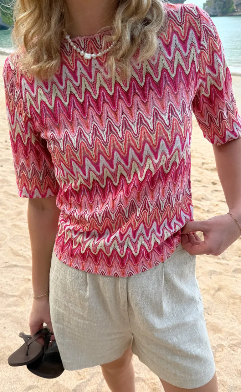 Smuk bluse fra INA Copenhagen med zigzag mønster i pinke nuancer og lurex glitter tråde.
