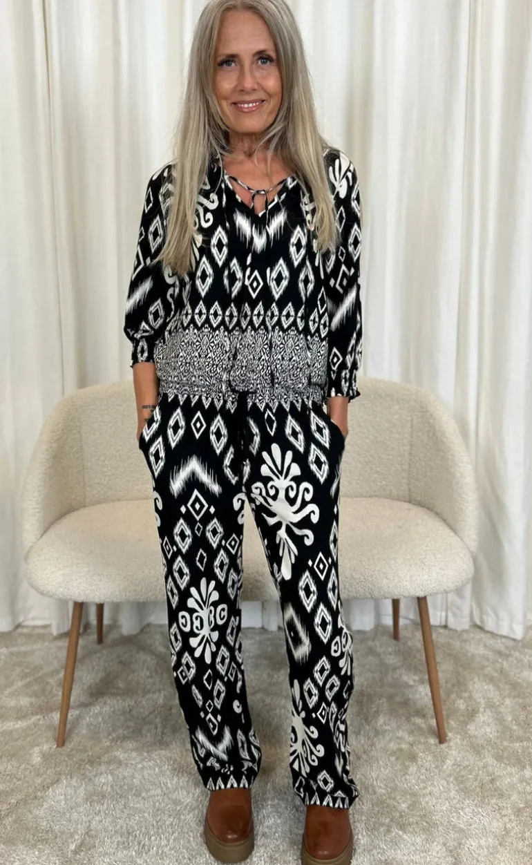 Blusen kan med fordel styles matchende INA Copenhagen Bukser – Tora – Black/White Paisley.