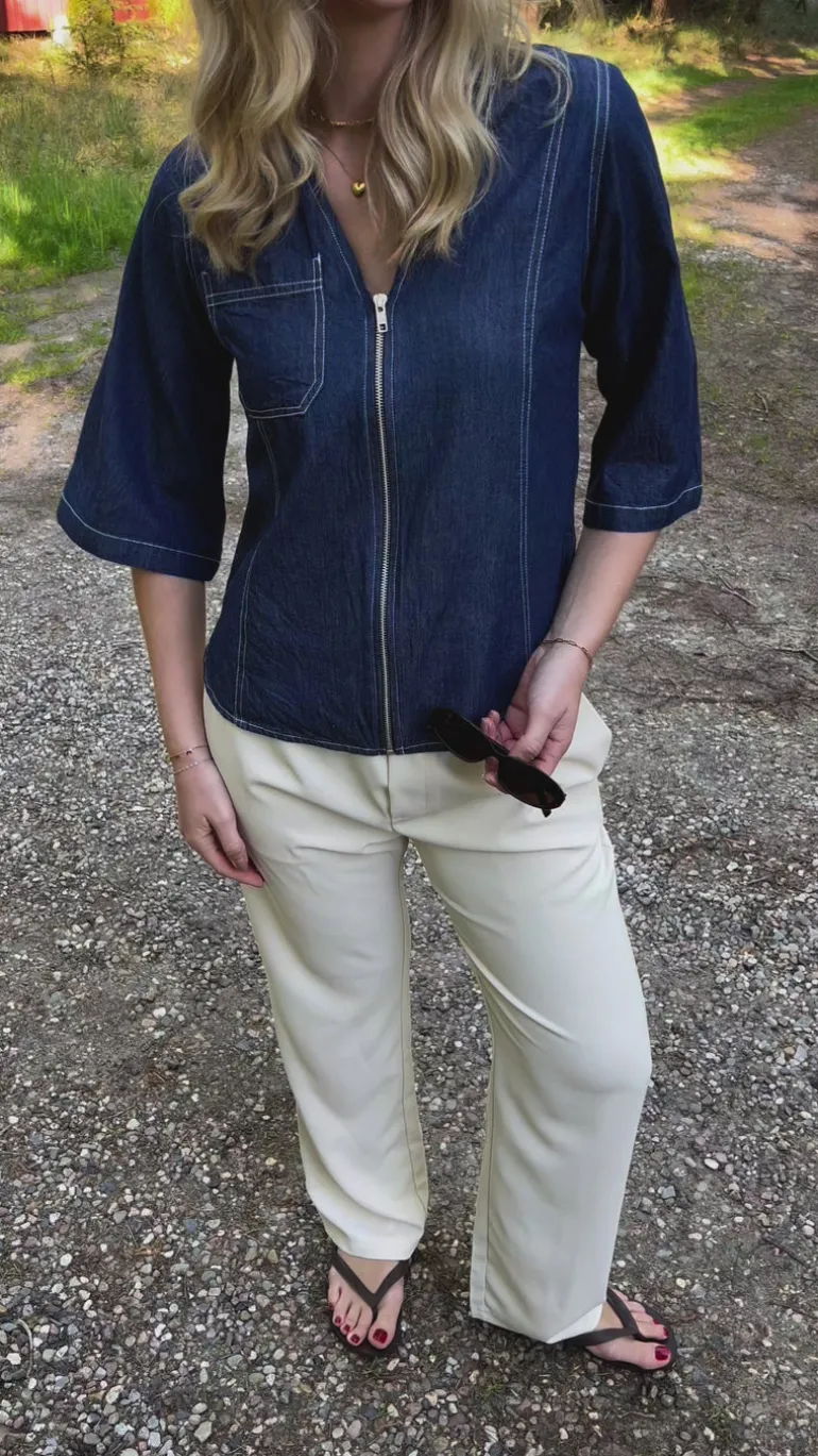 Smart bluse fra INA Copenhagen i en blå denim kvalitet med hvide syninger.