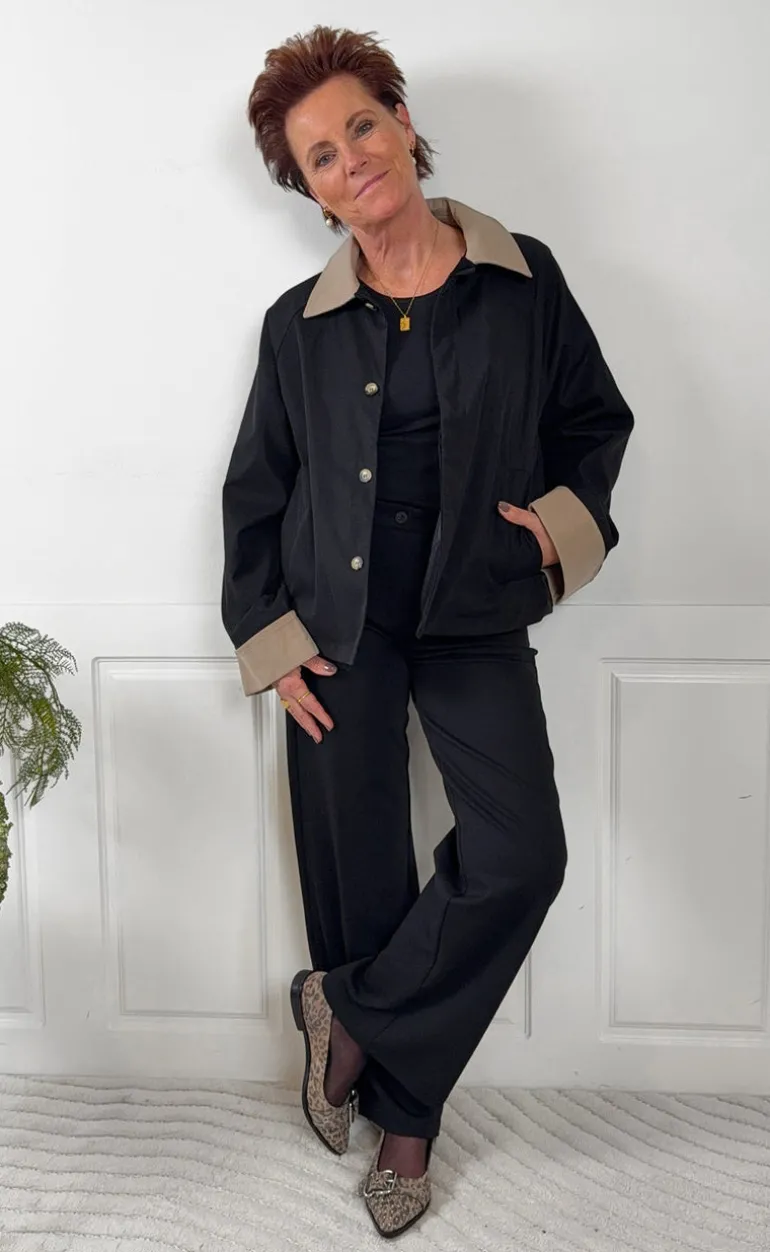 Smart trenchcoat fra INA Copenhagen i sort med camel detaljer ved håndled og krave.