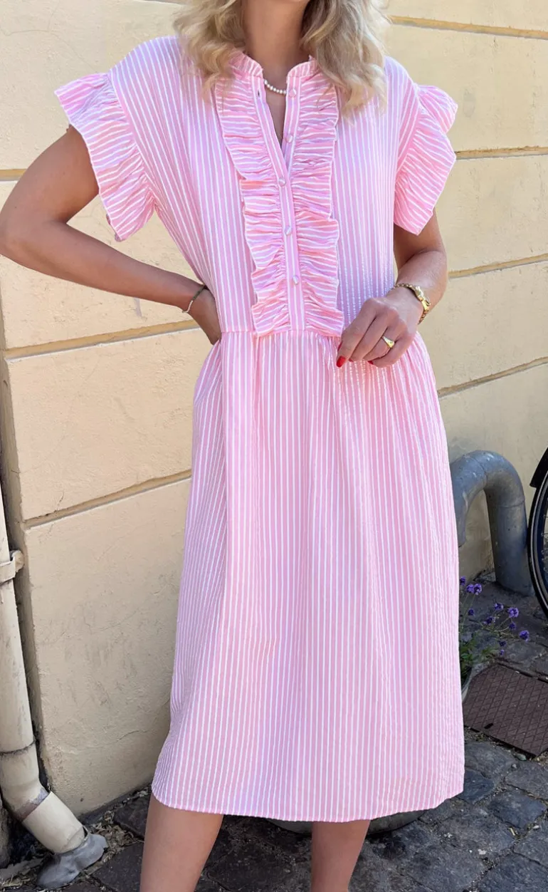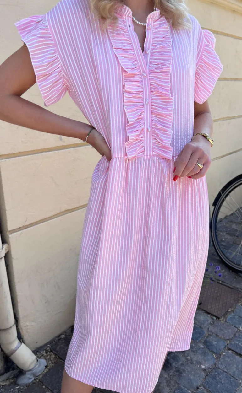 Kjolen er lavet i et lækkert print med hvide og lyserøde striber, og den kan styles på mange forskellige måder!