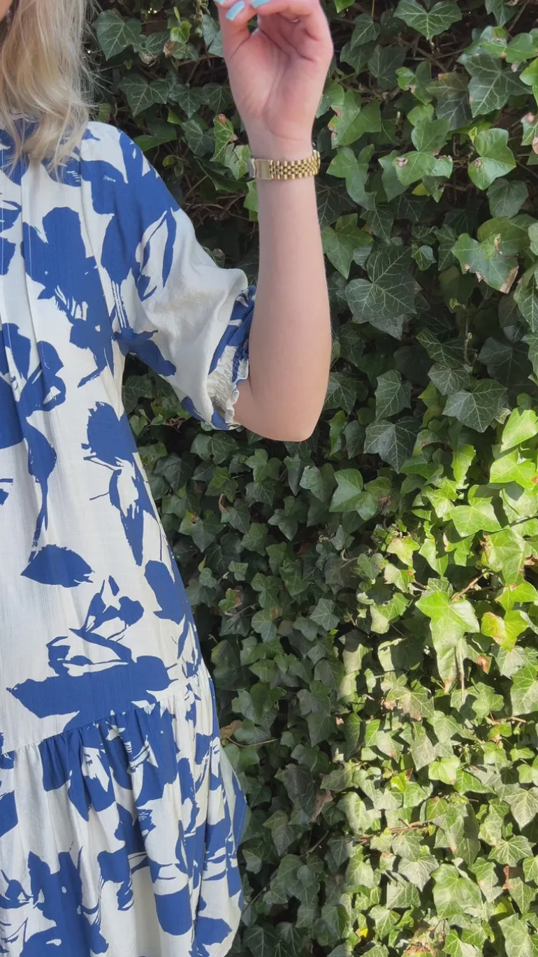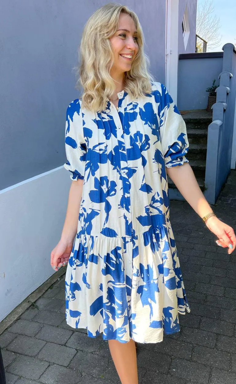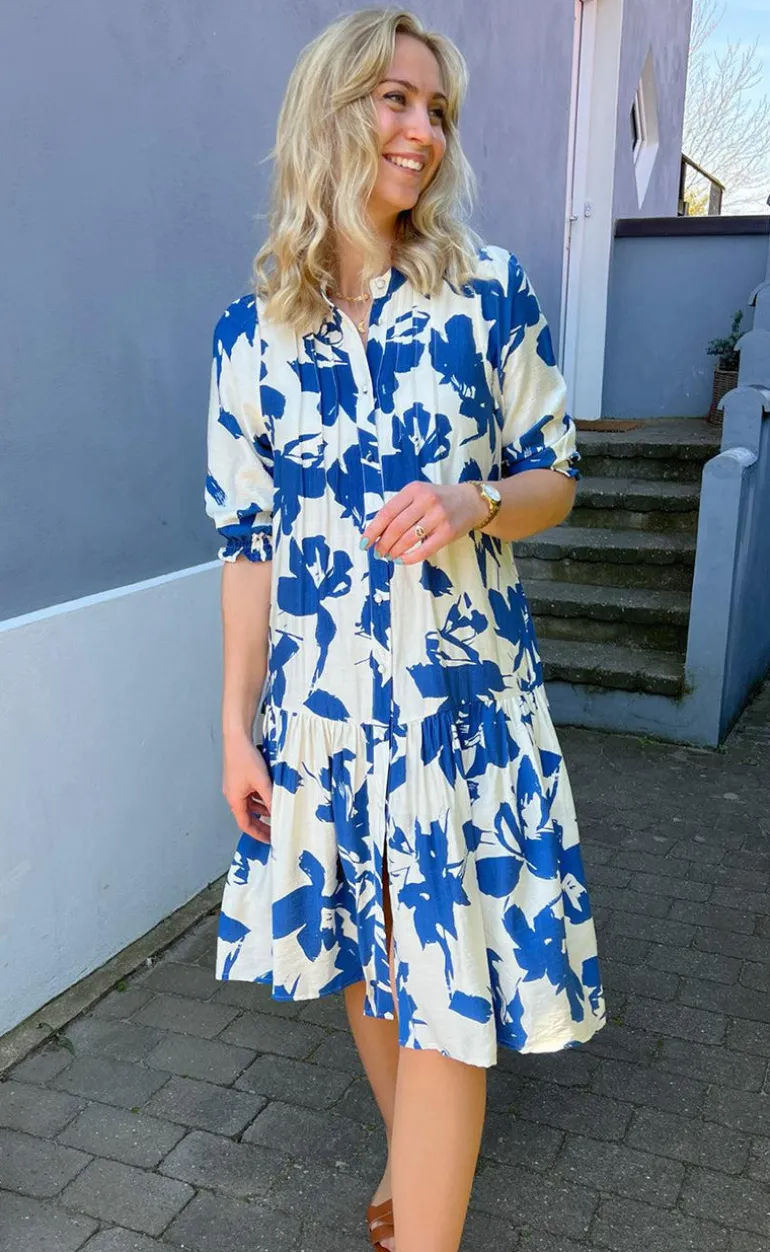 Smuk kjole fra INA Copenhagen i hvid med blå blomster.